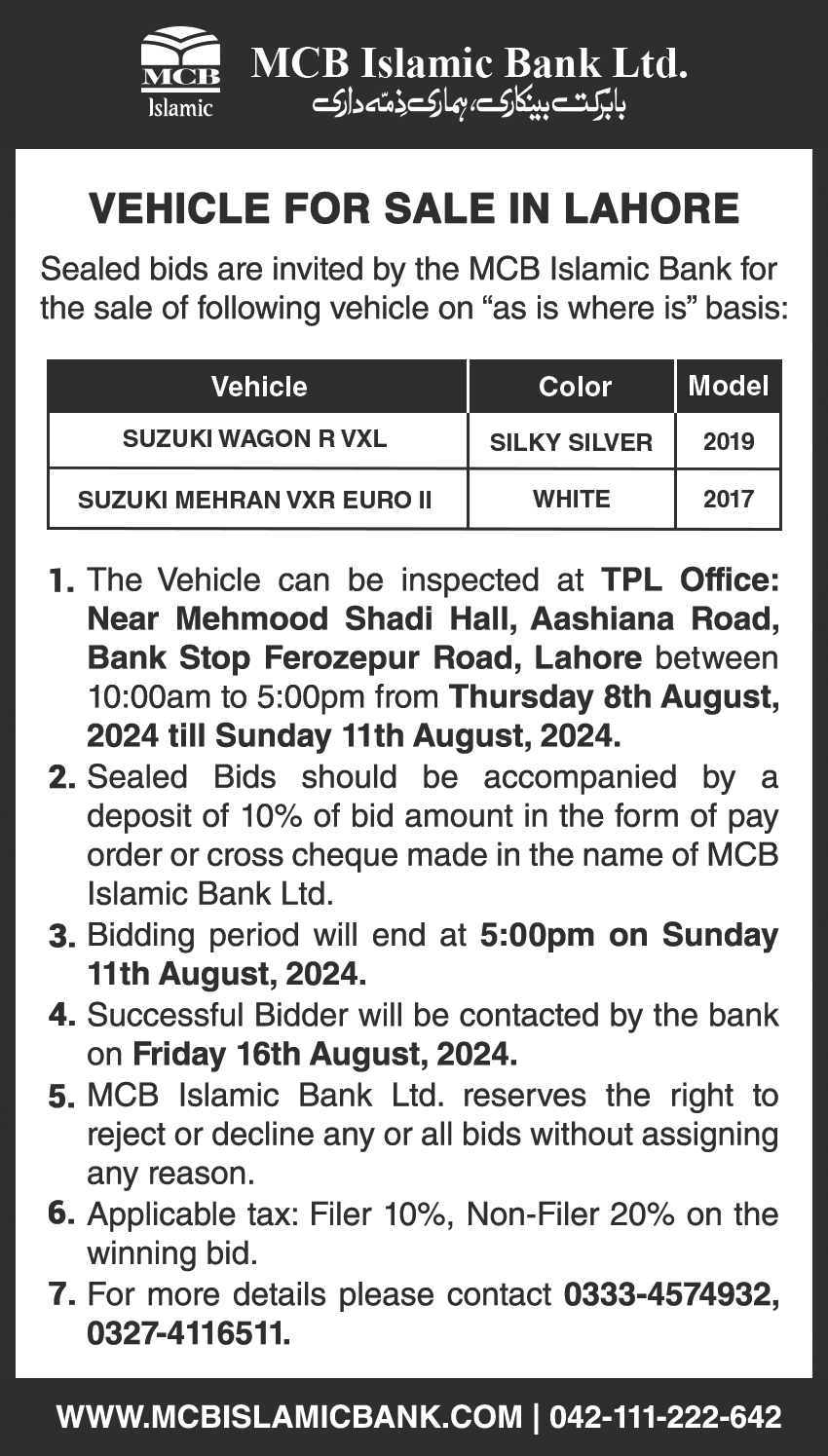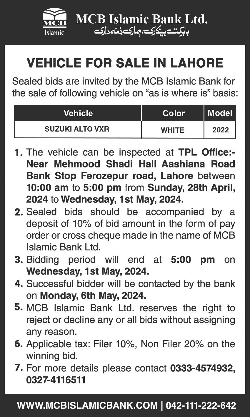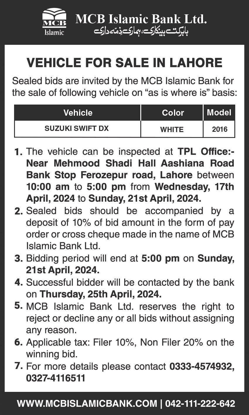 Auction Ad – Vehicle for sale in Lahore & Islamabad (April 17,2024)