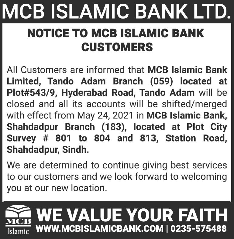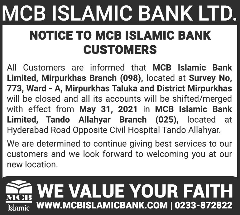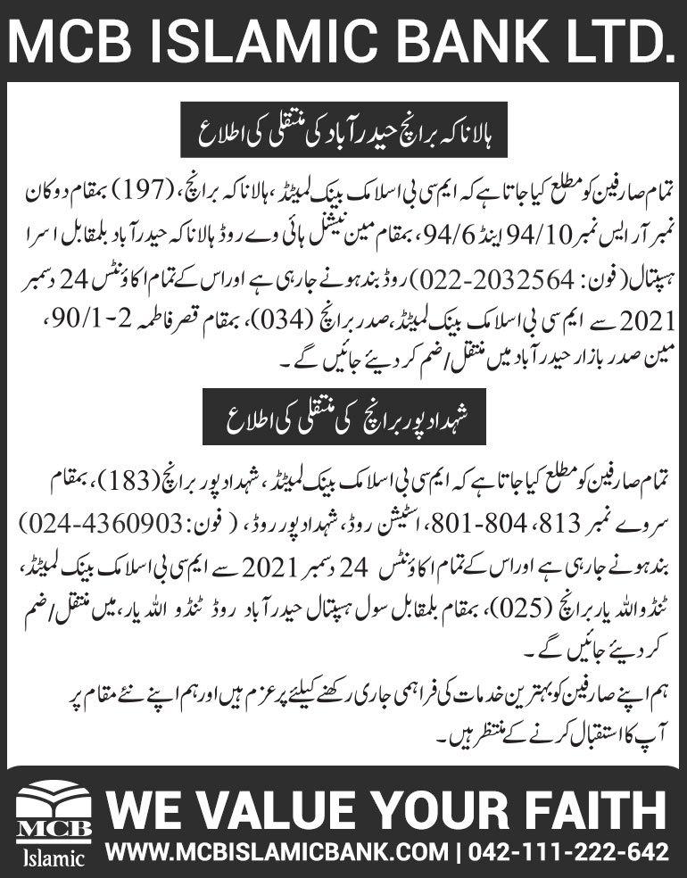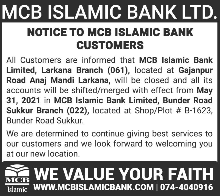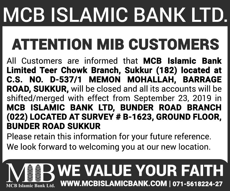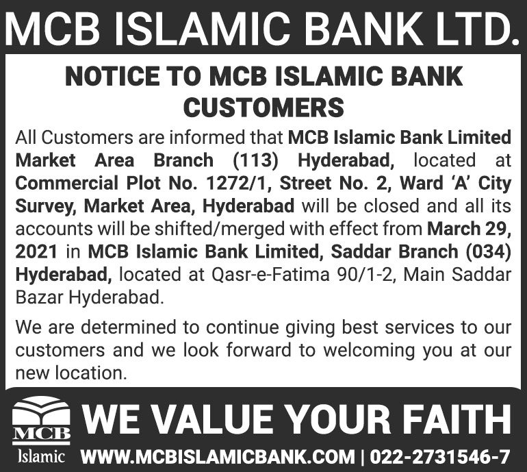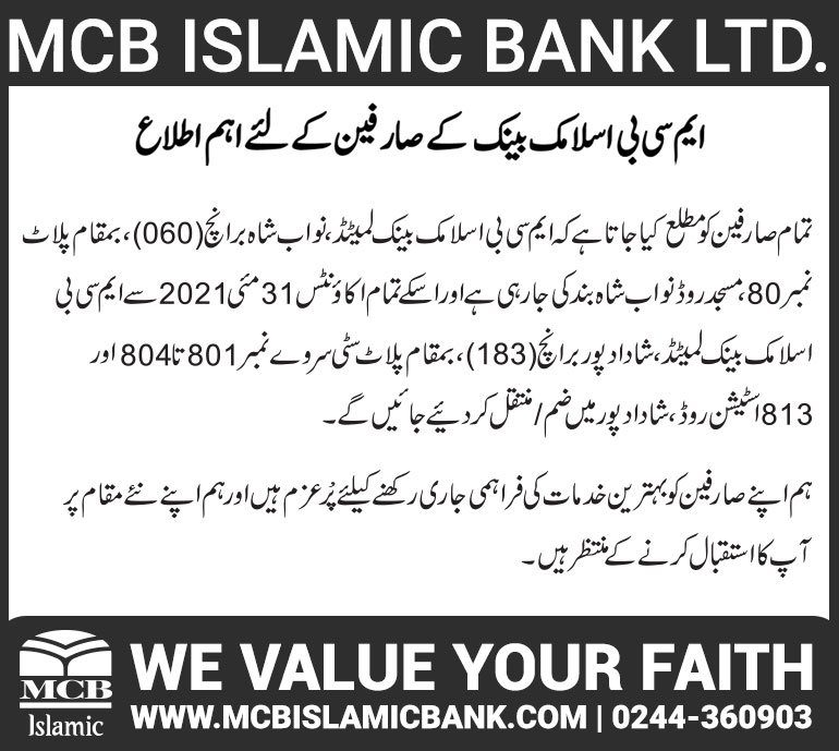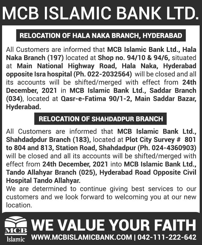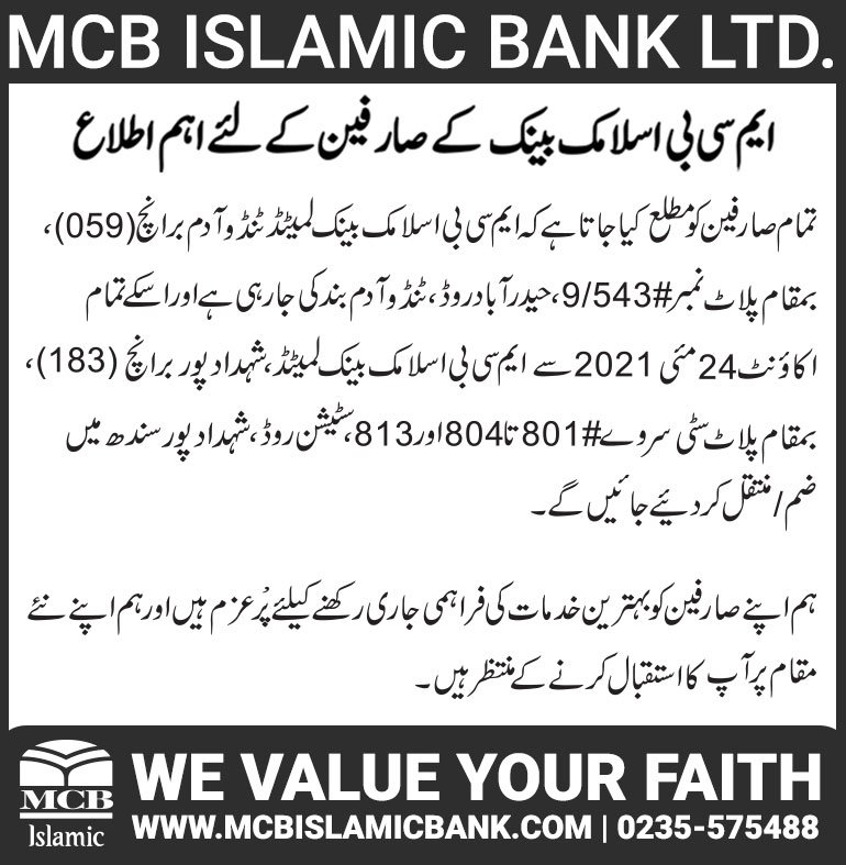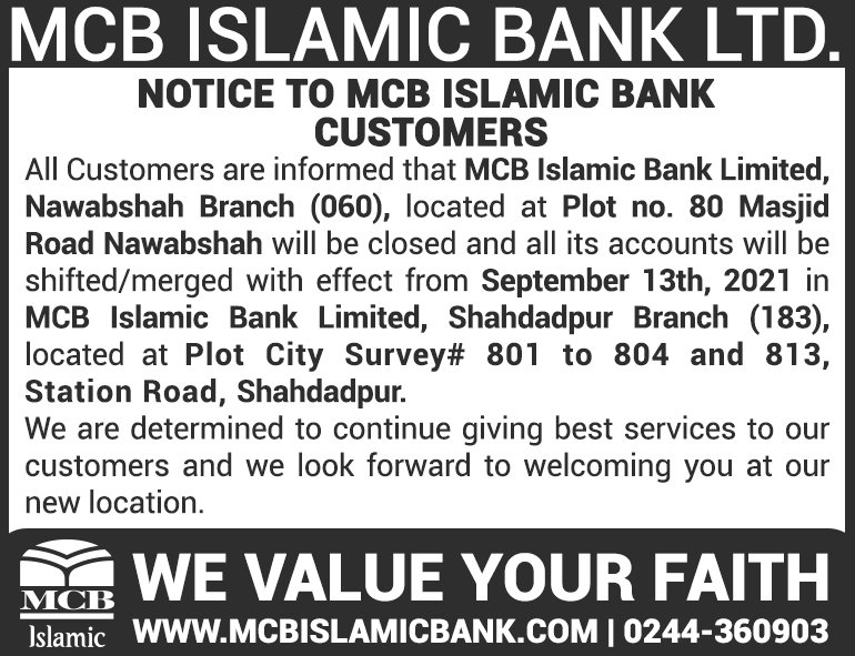 Closure of MCB Islamic Bank Shahdadpur and Halanaka, Hyderabad Branches