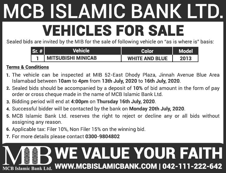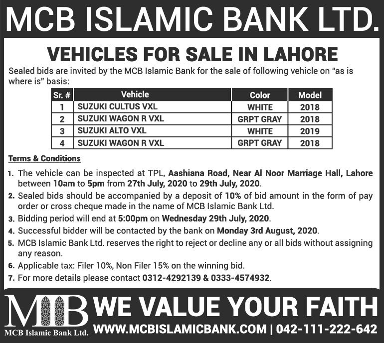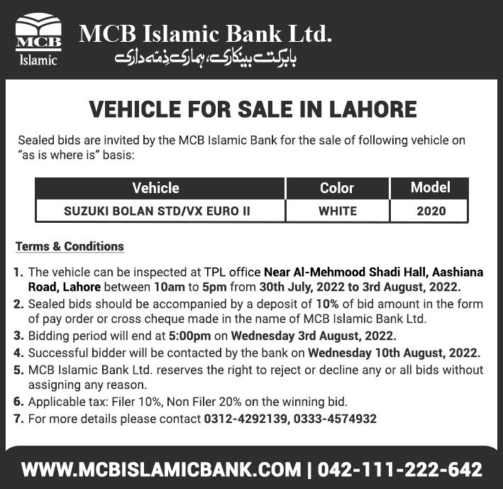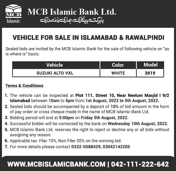 Auction Ad – Vehicle for Sale in Islamabad & Rawalpindi (July 31, 2022)