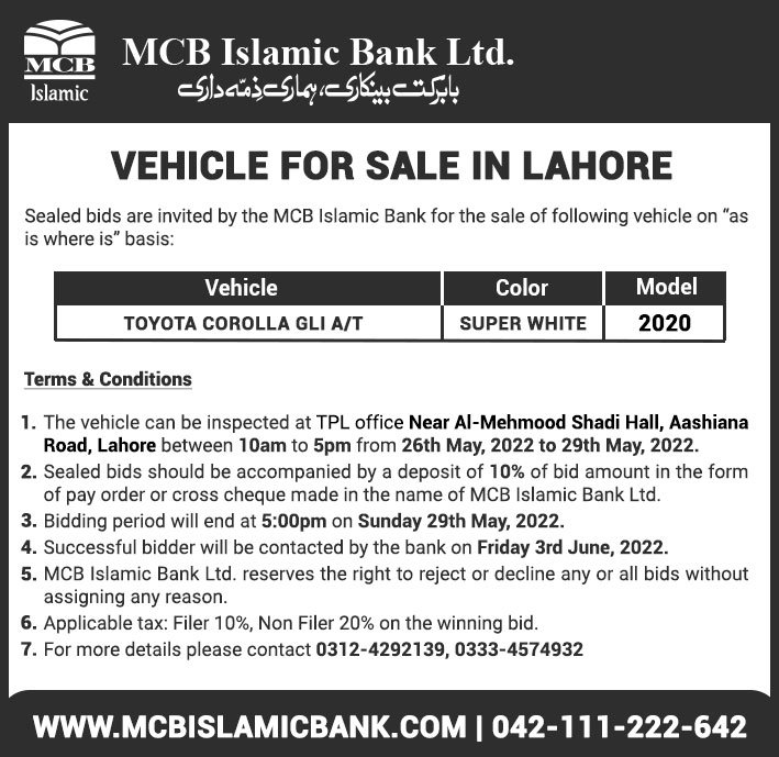 Auction Ad – Vehicle for Sale in Lahore (May 25, 2022)