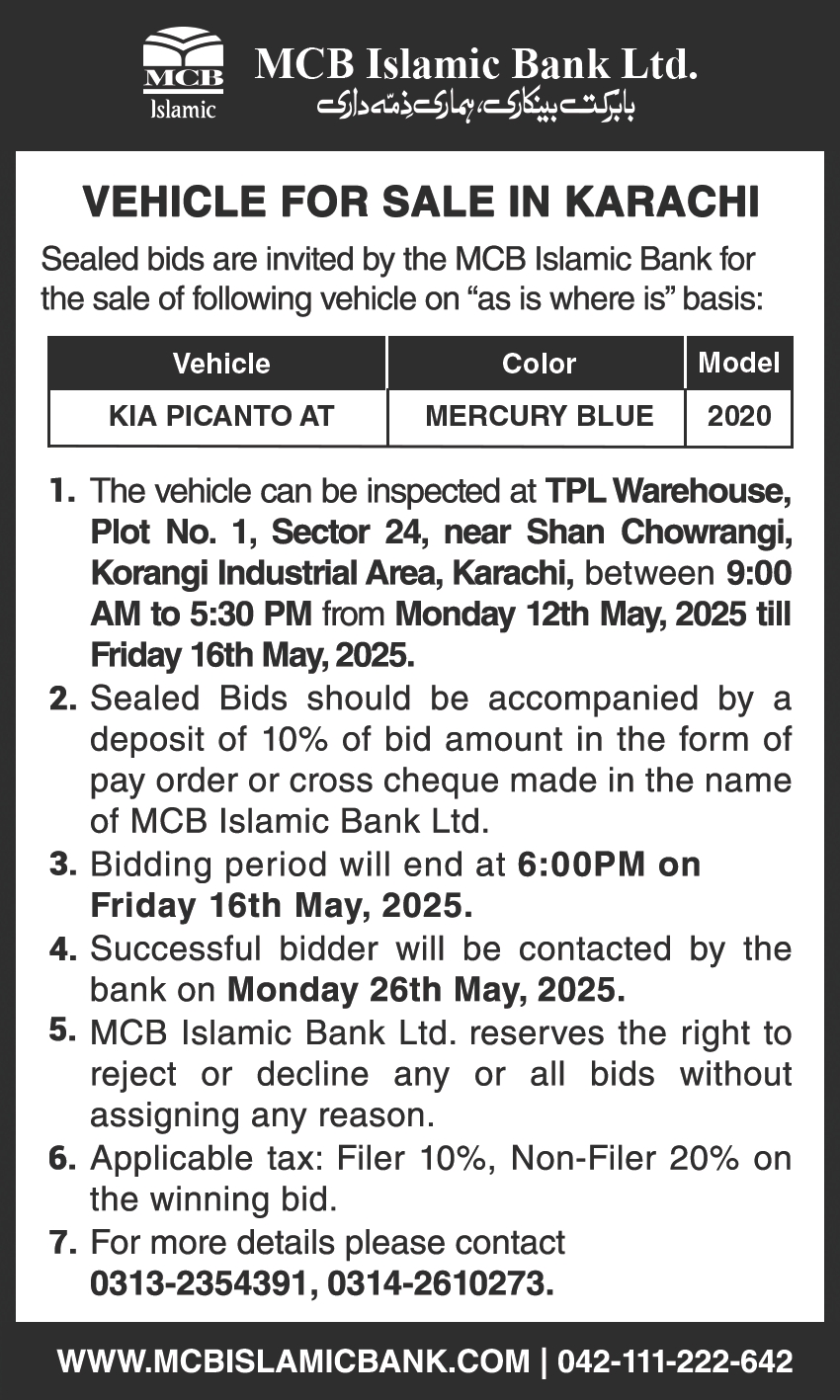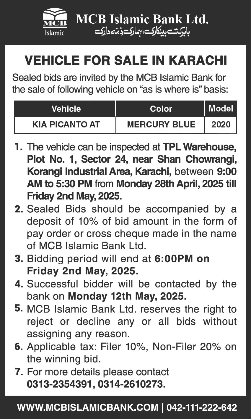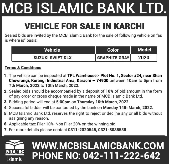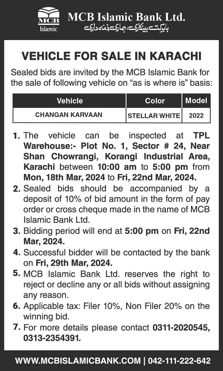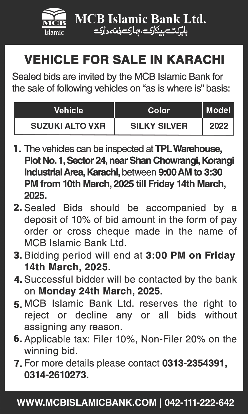 Auction Ad – Vehicle for Sale in Karachi (March 06, 2022)