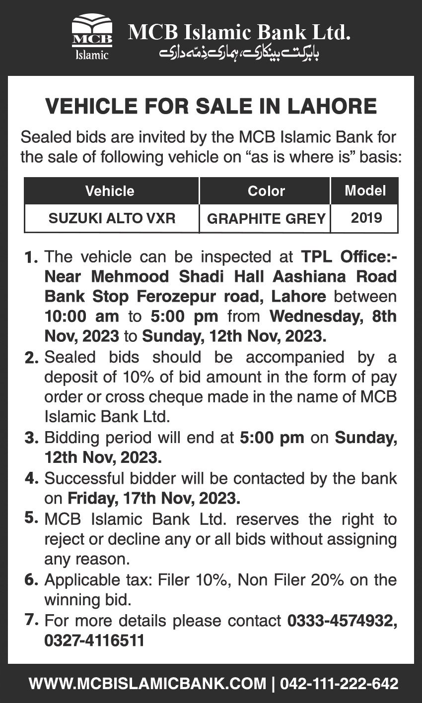 Auction Ad – Vehicle for Sale in Lahore (October 31, 2021)
