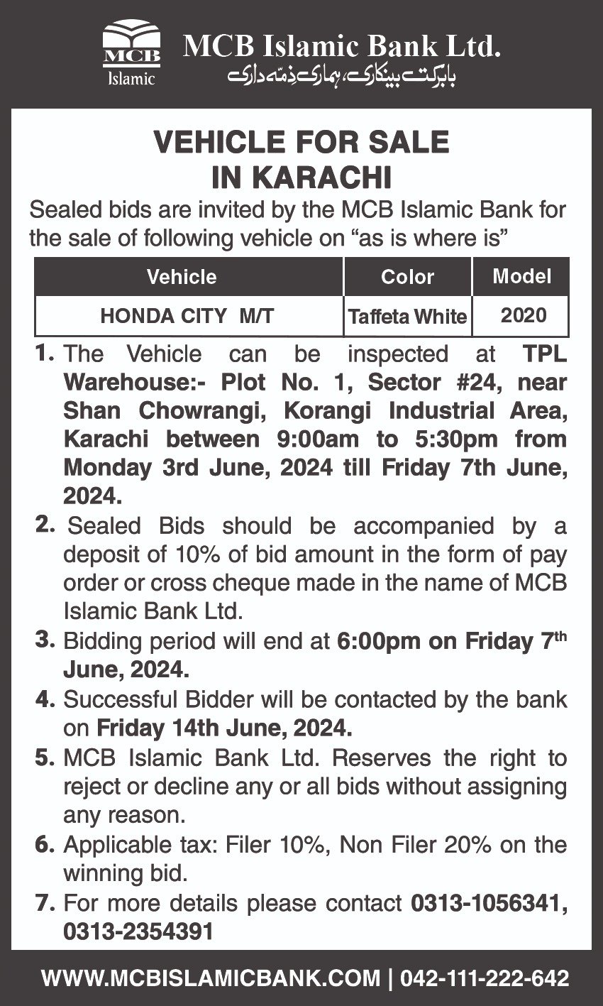 Auction Ad – Vehicle for sale in Karachi (June 1, 2024)