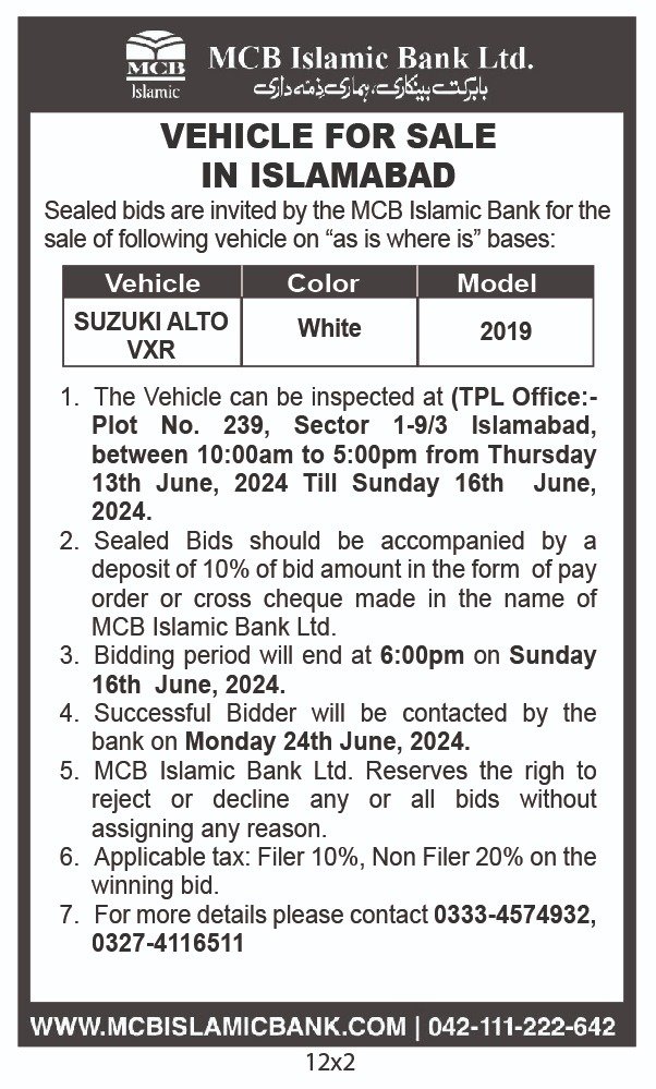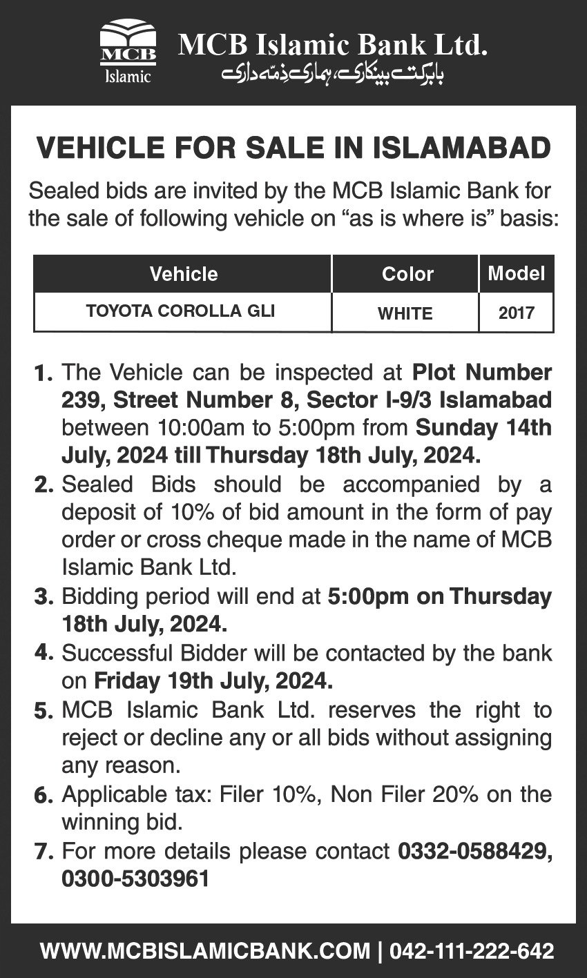 Auction Ad – Vehicle for Sale in Islamabad (July 14, 2024)