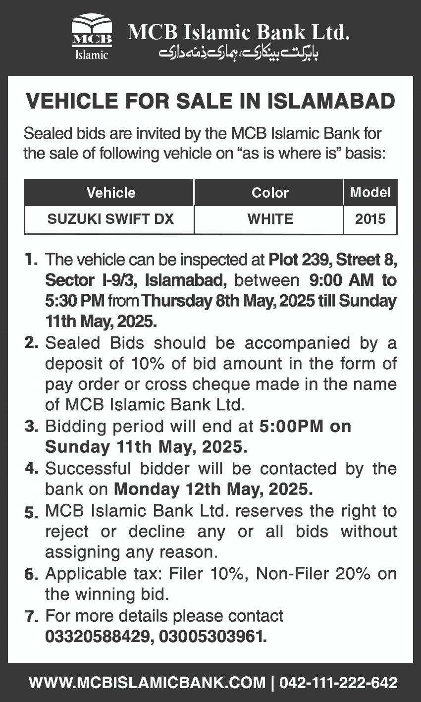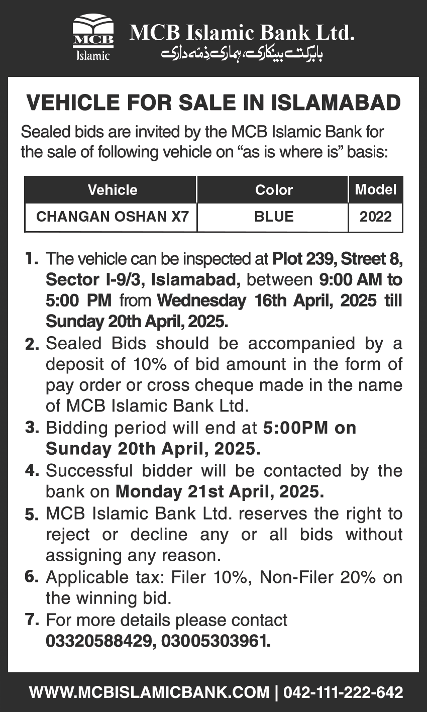 Auction Ad – Vehicle for sale in Islamabad (October 7, 2024)