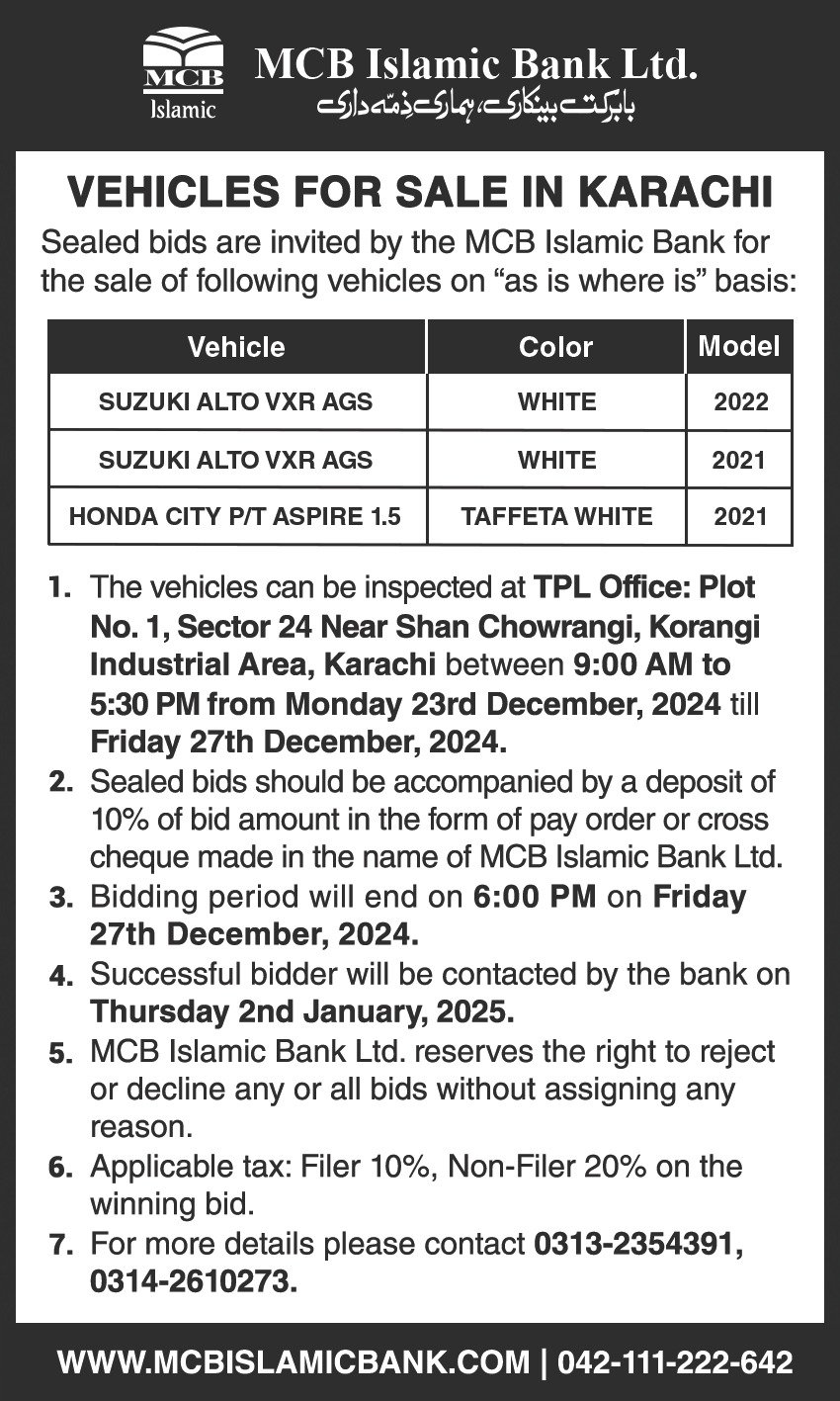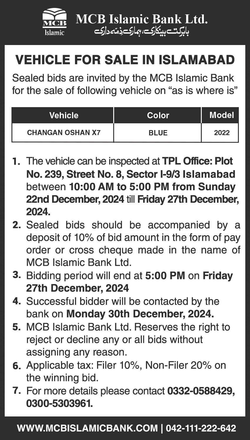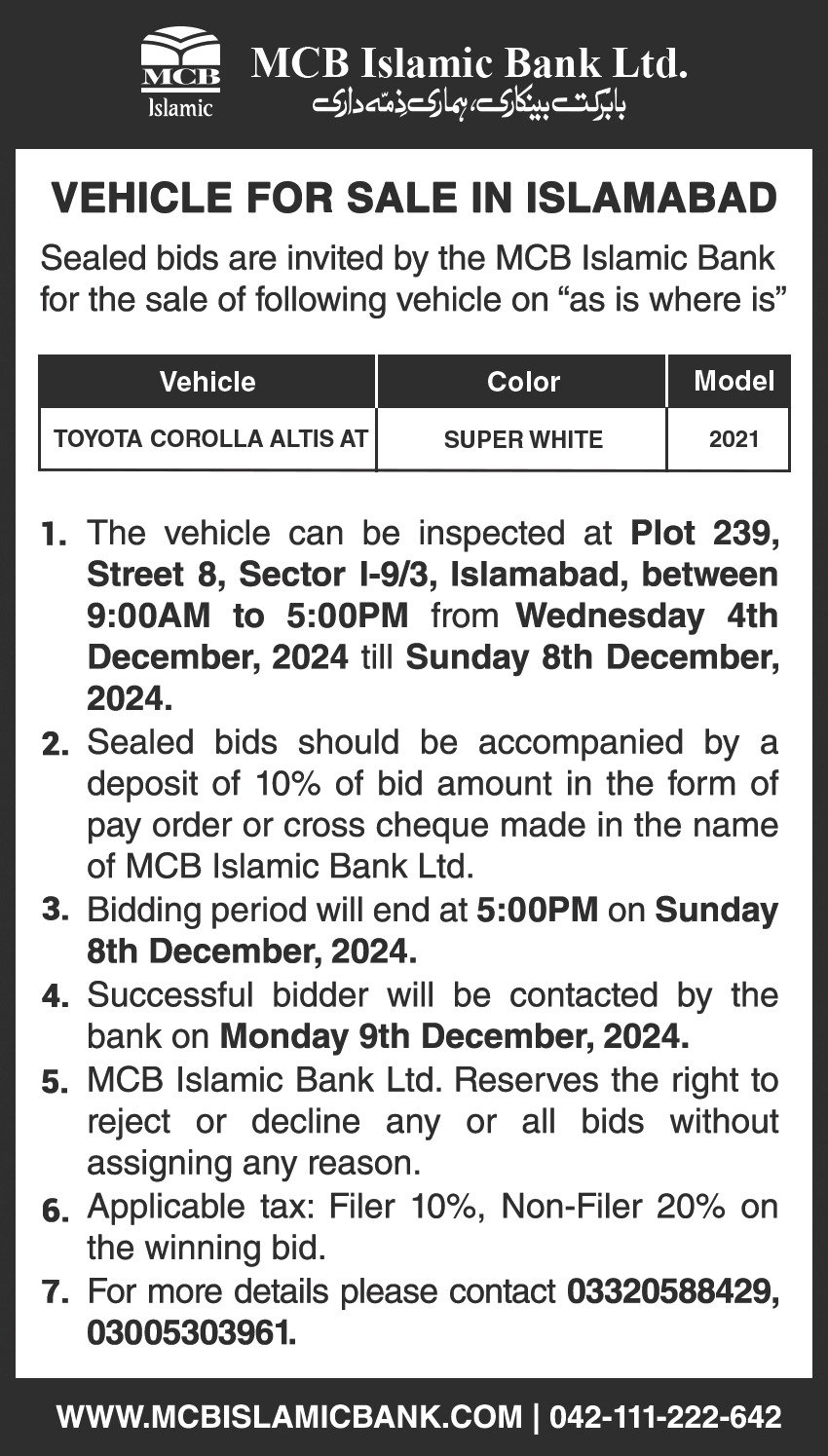 Auction Ad – Vehicle for Sale In Islamabad (December 4, 2024)