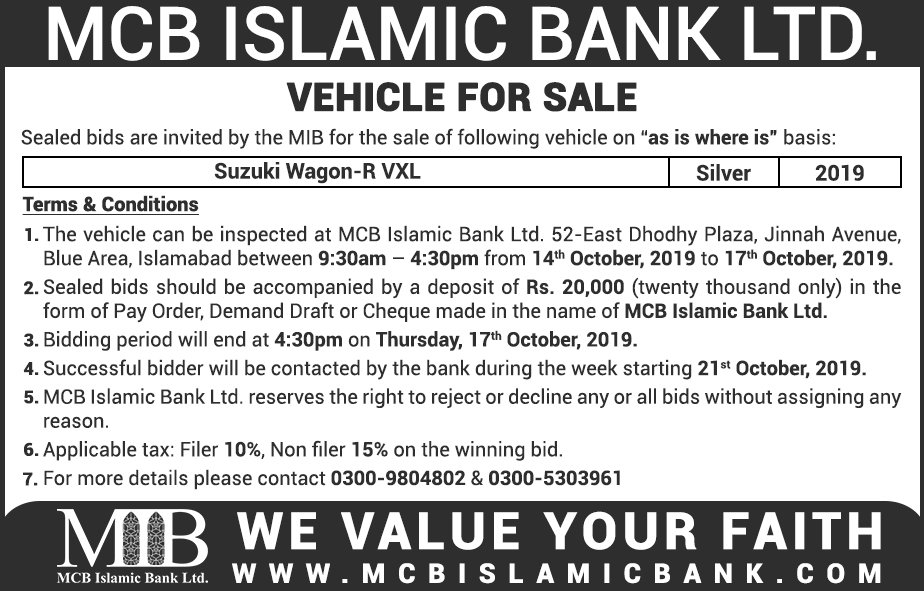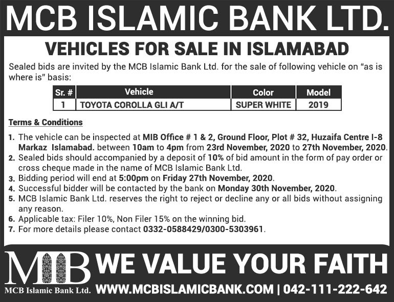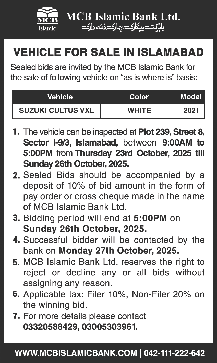 Auction Ad – Vehicle for Sale in Islamabad (October 10, 2021)