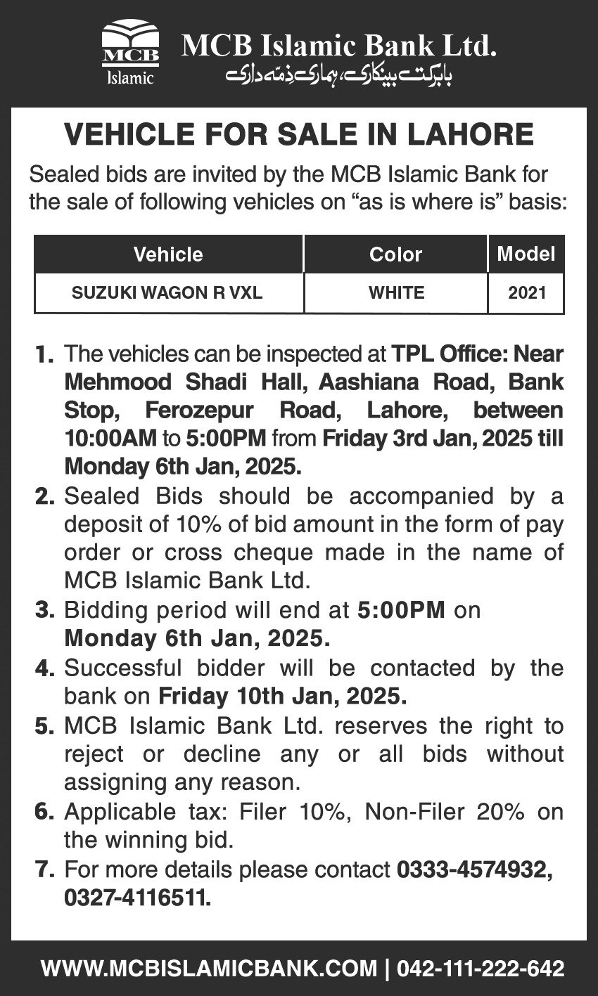 Auction Ad – Vehicle for Sale in Lahore (December 25, 2021)