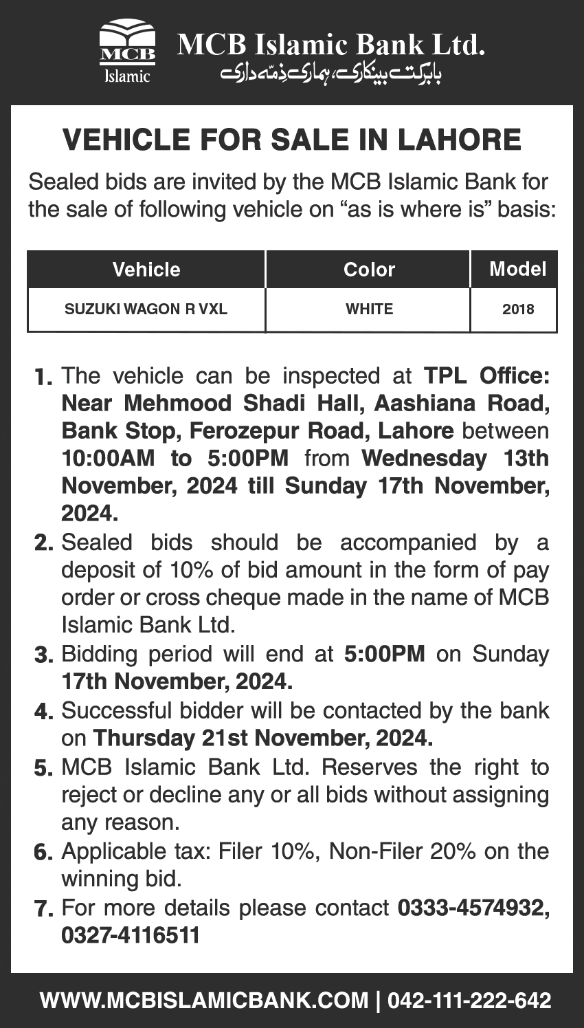 Auction Ad – Vehicle for Sale In Lahore (November 2, 2024)