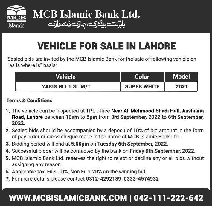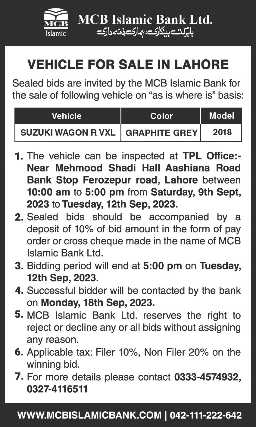Auction Ad – Vehicle for Sale in Lahore (September 03, 2022)