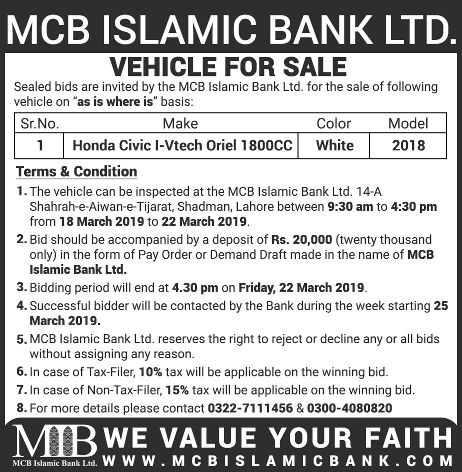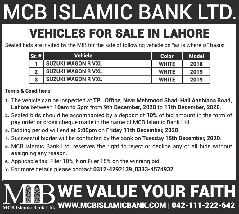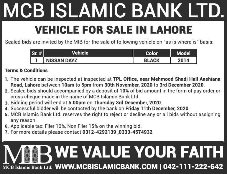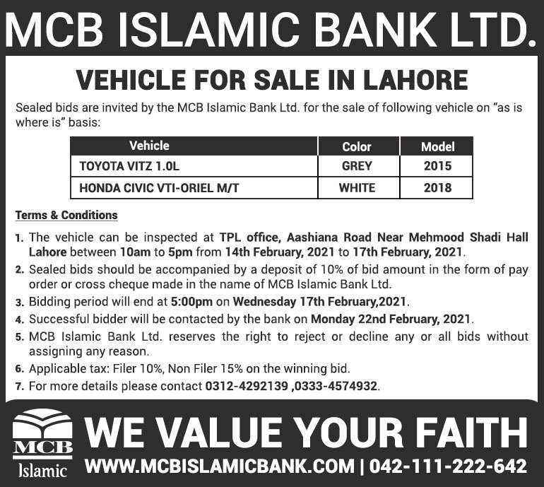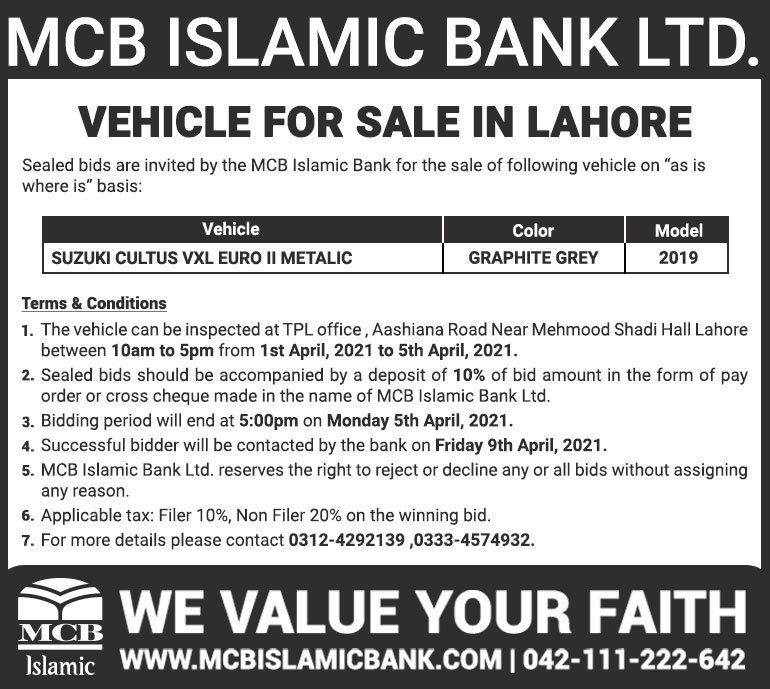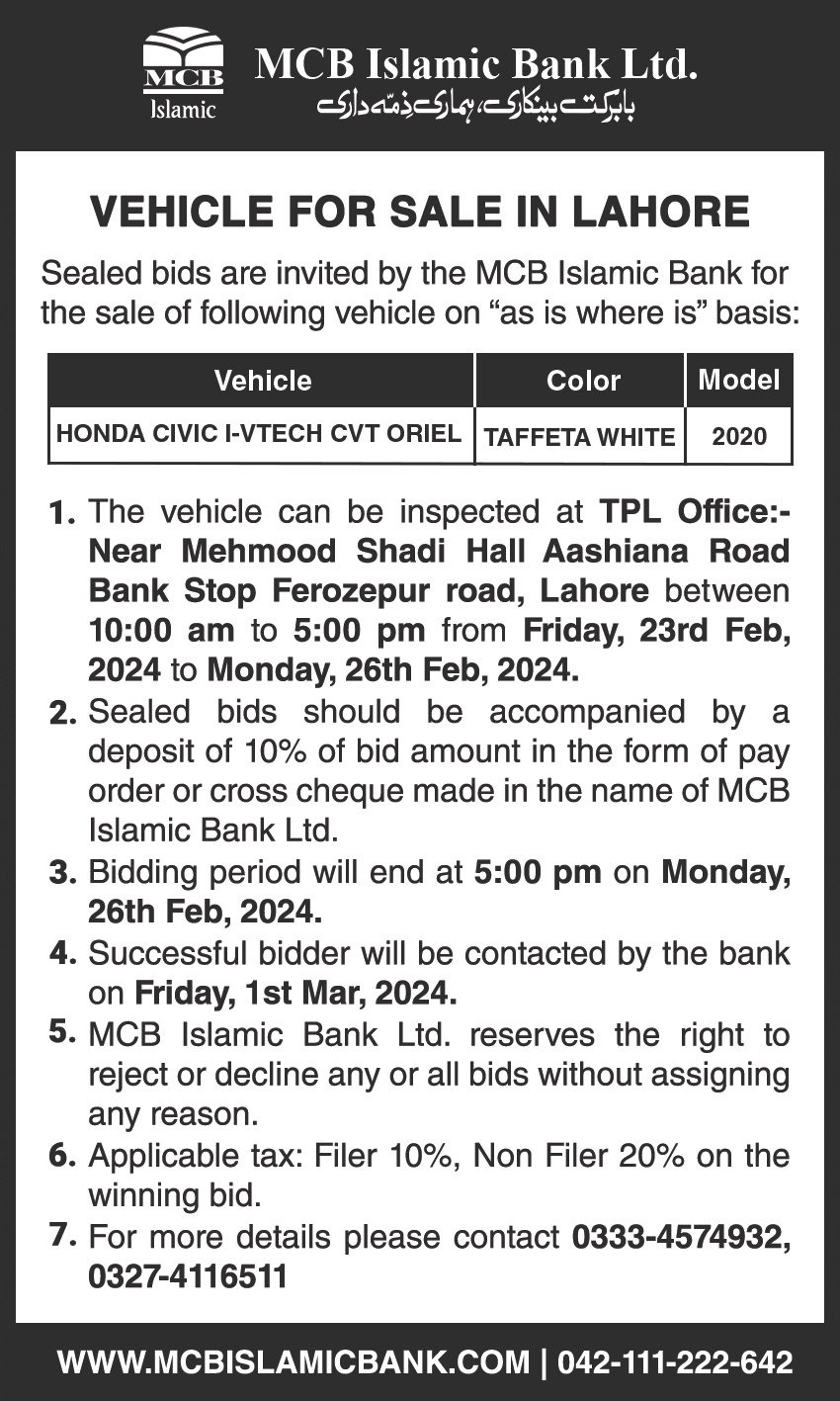 Auction Ad – Vehicle for Sale in Lahore (Feb 14, 2021)