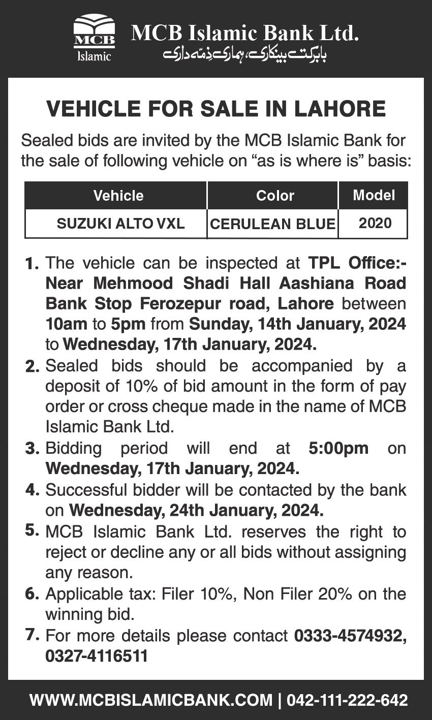 Auction Ad- Vehicle for sale in Lahore (January 14, 2024)