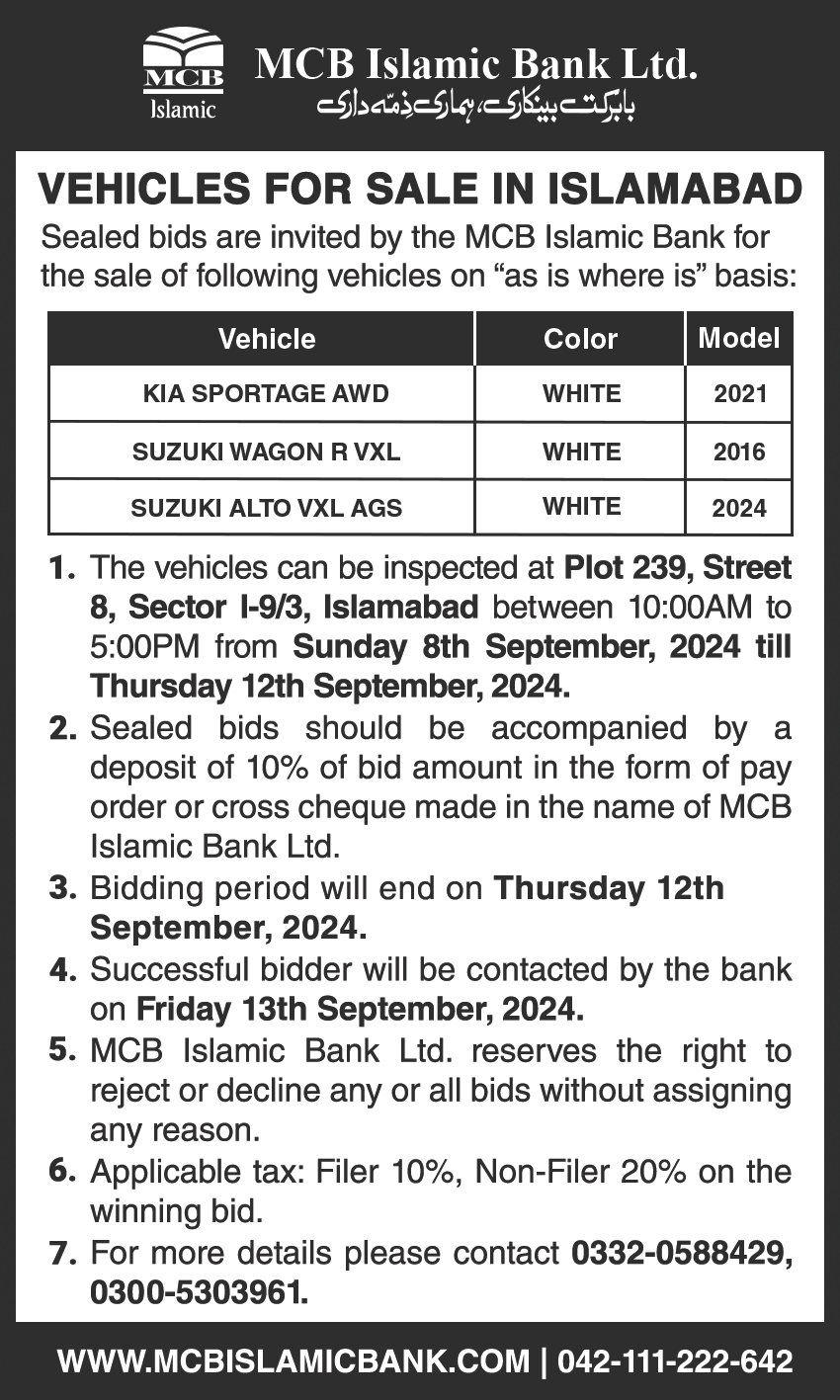 Auction Ad- Vehicles for sale in Islamabad (September 8, 2024)