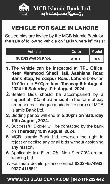 Auction Ad – Vehicle for sale in Lahore (August 6th , 2024)
