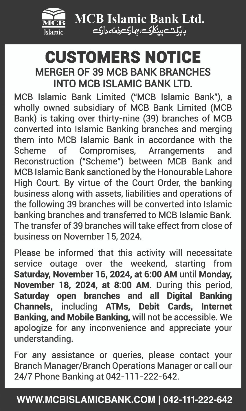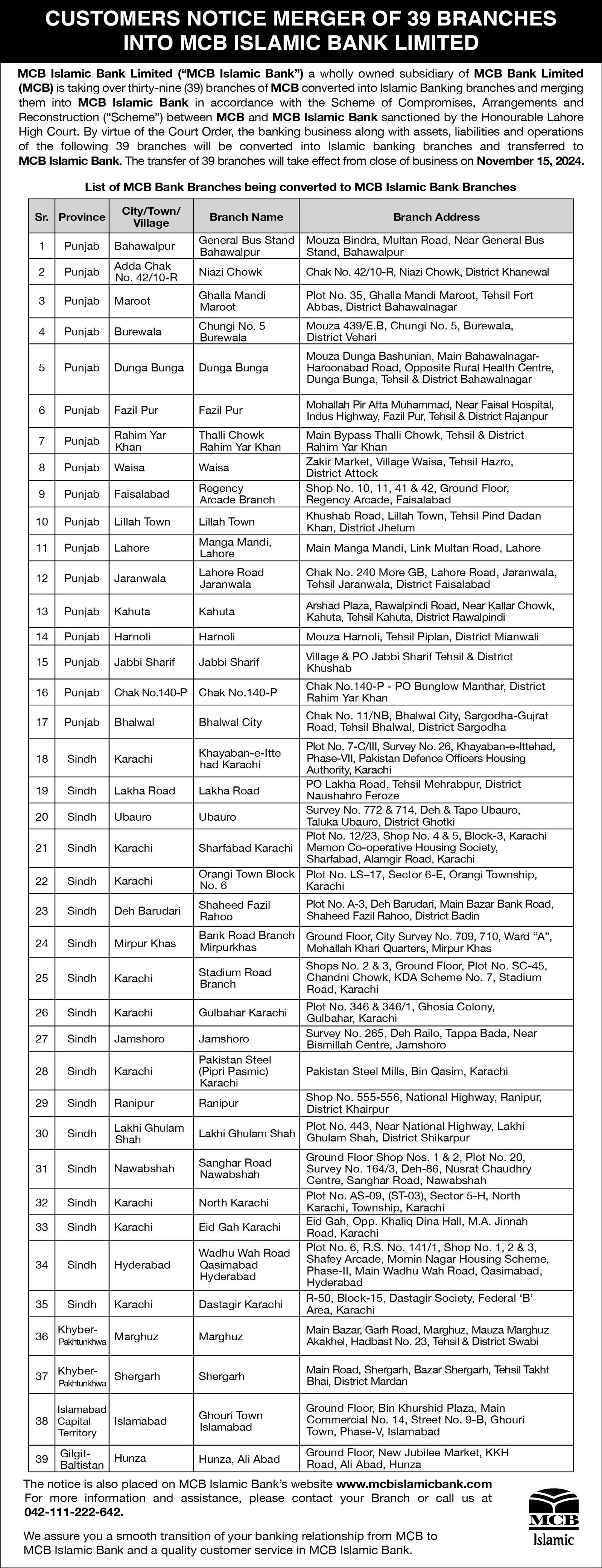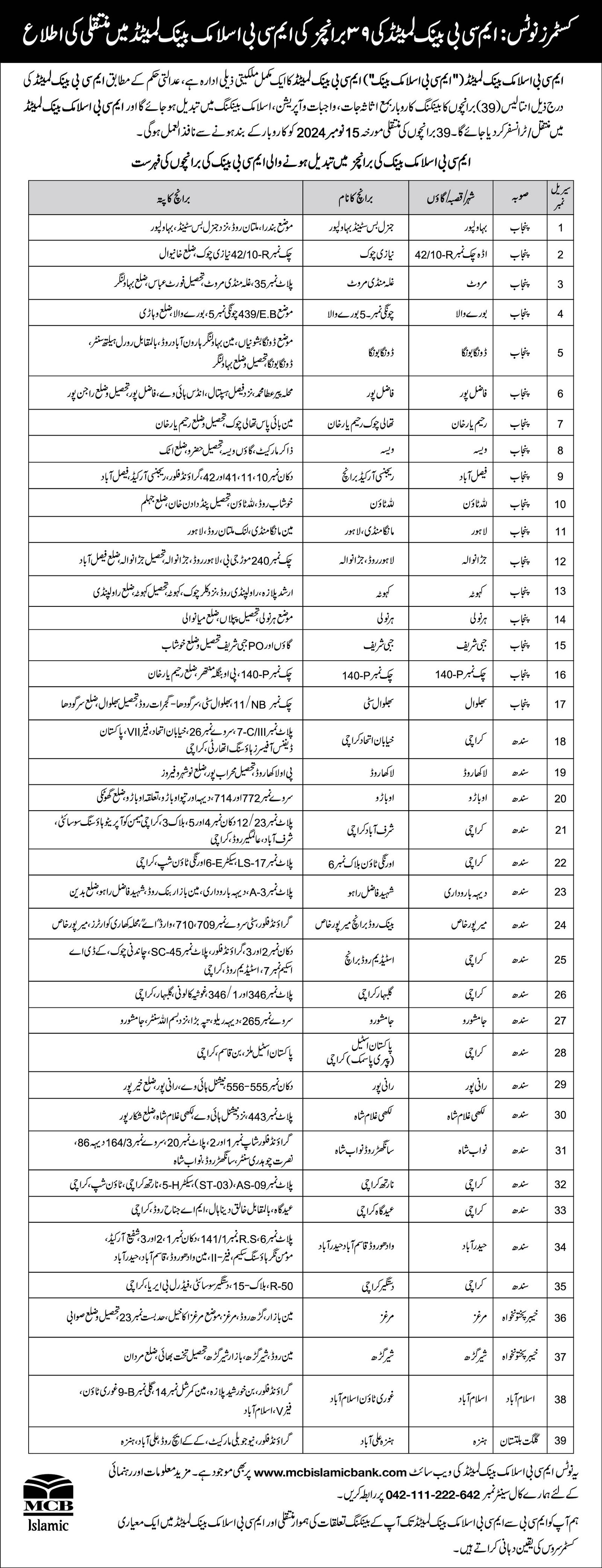 Merger of MCB BANK 39 Branches into MCB Islamic Bank (November 1, 2024)