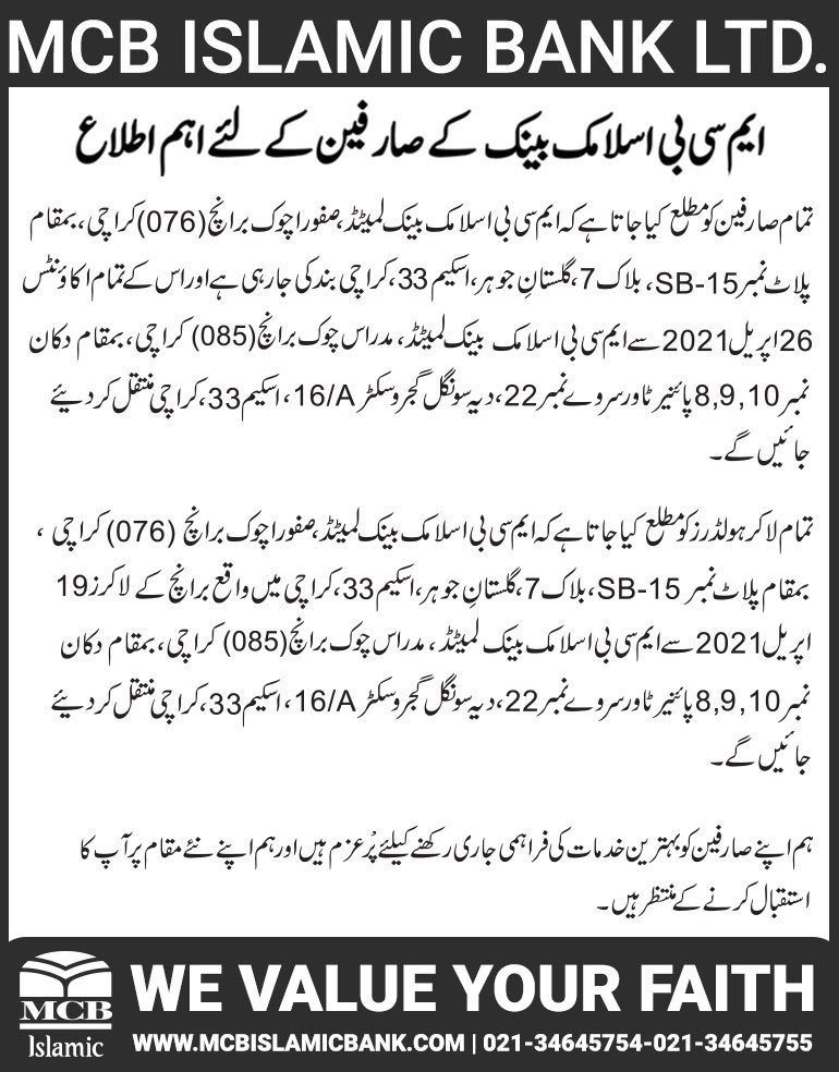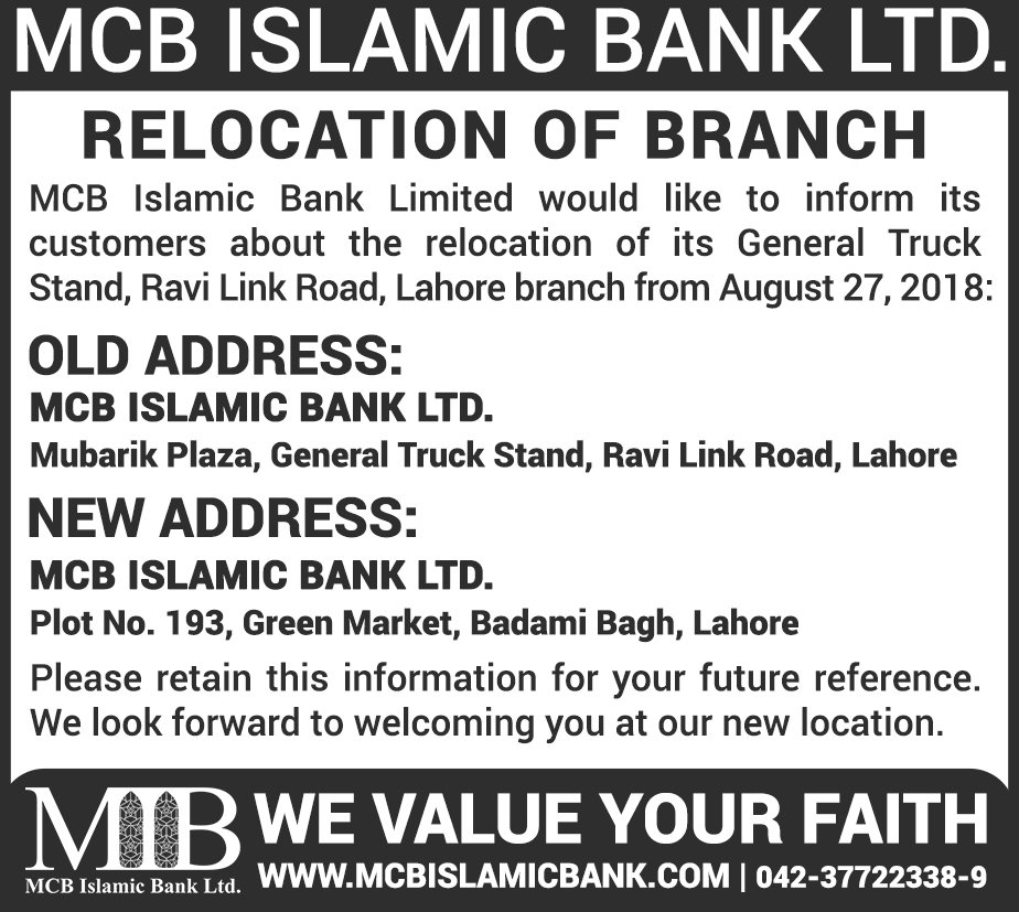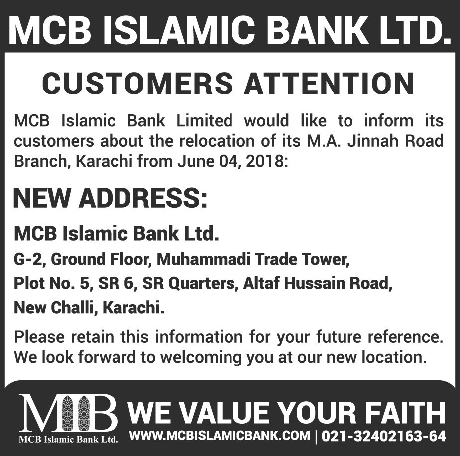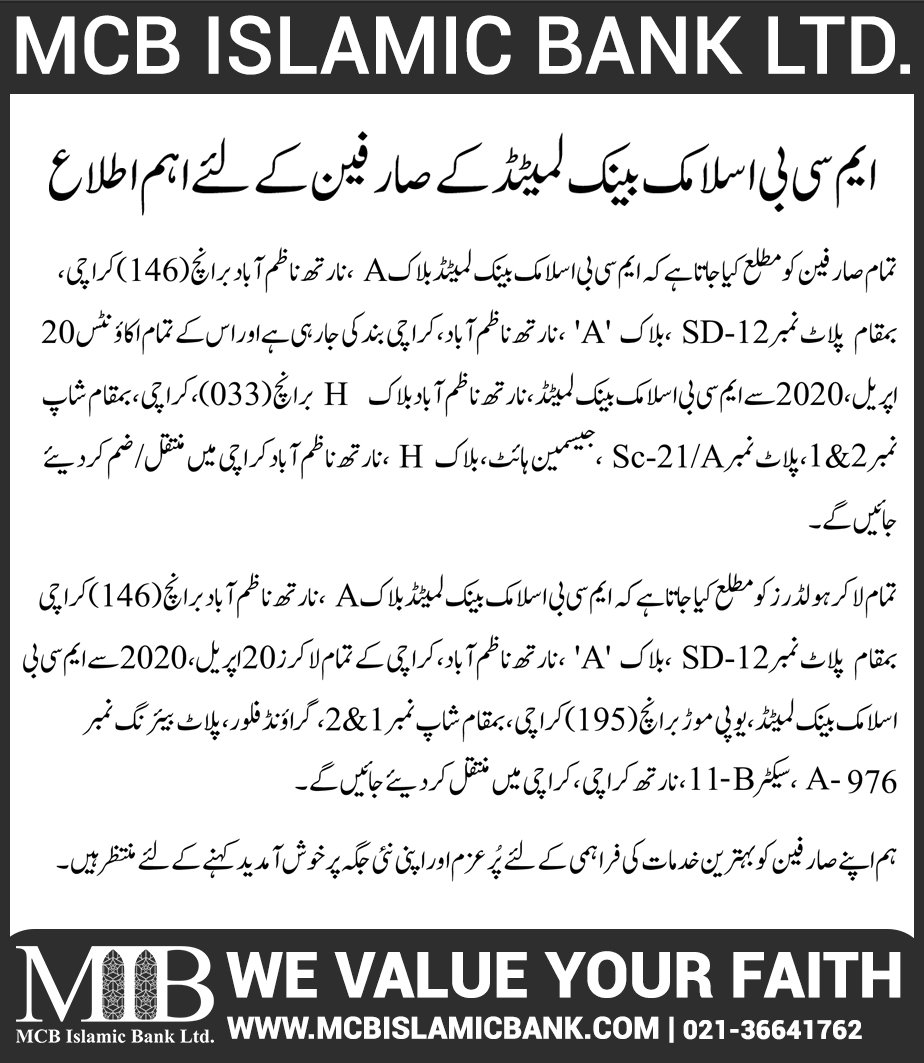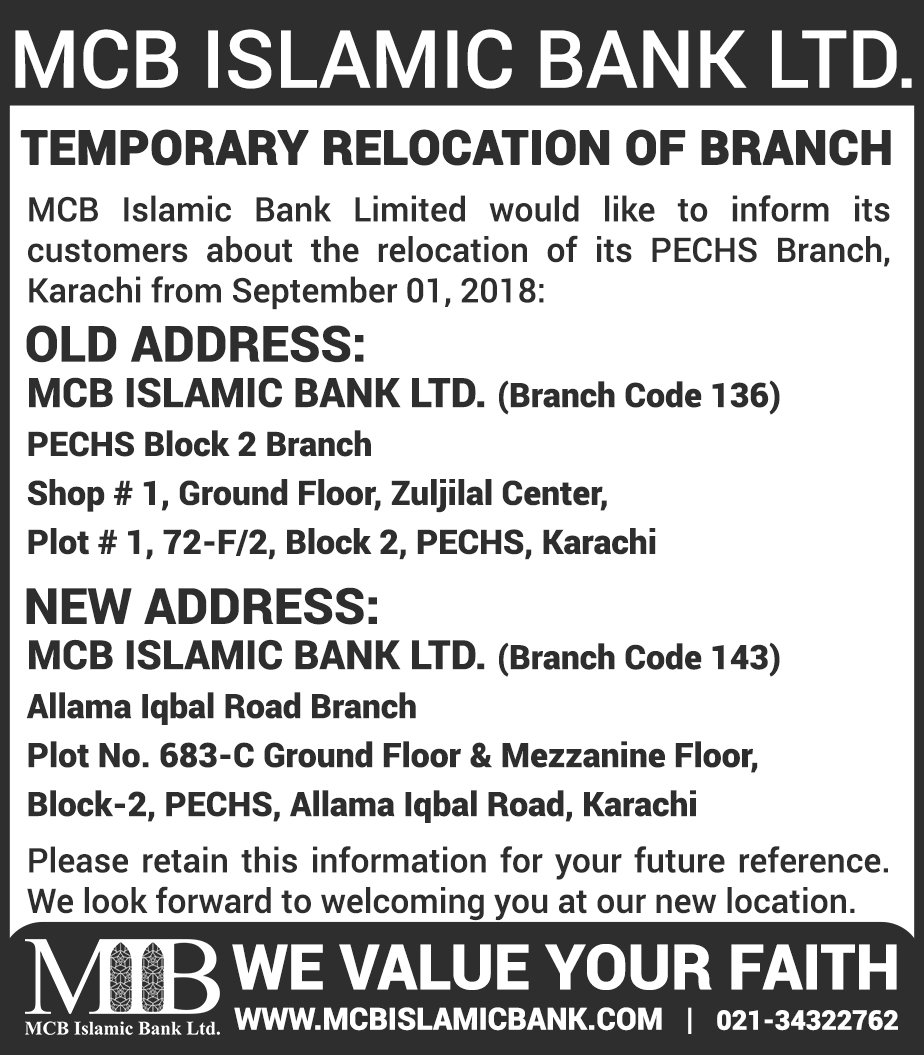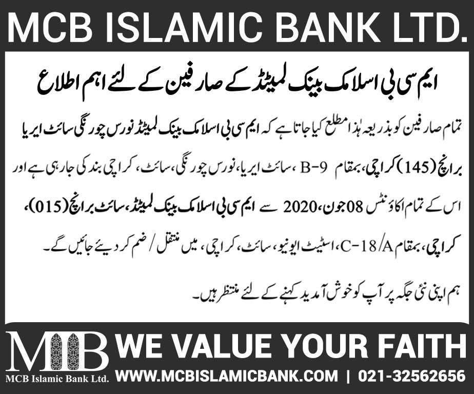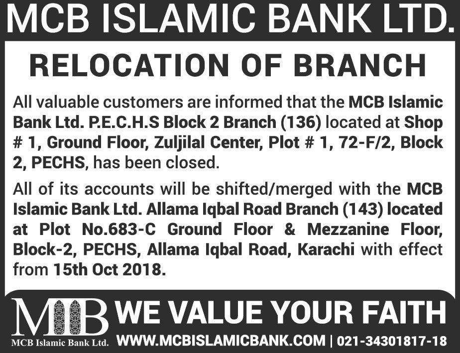 Relocation of MCB Islamic Bank Dhoraji Branch Karachi