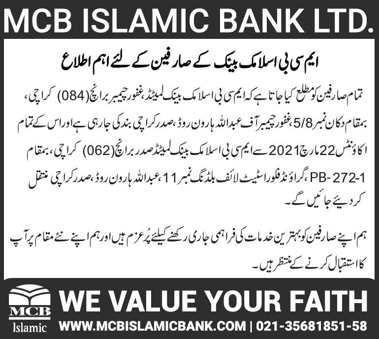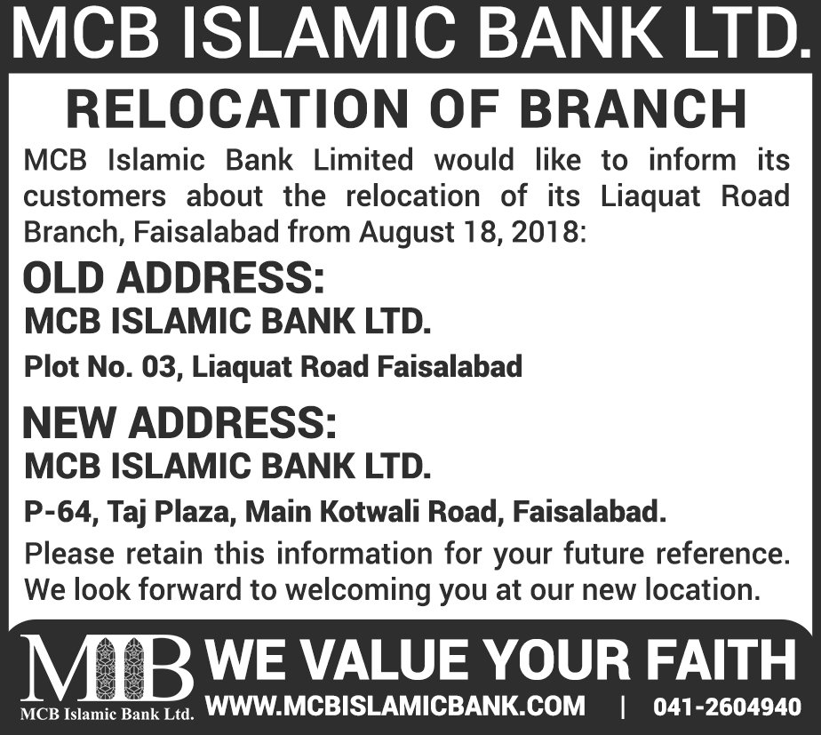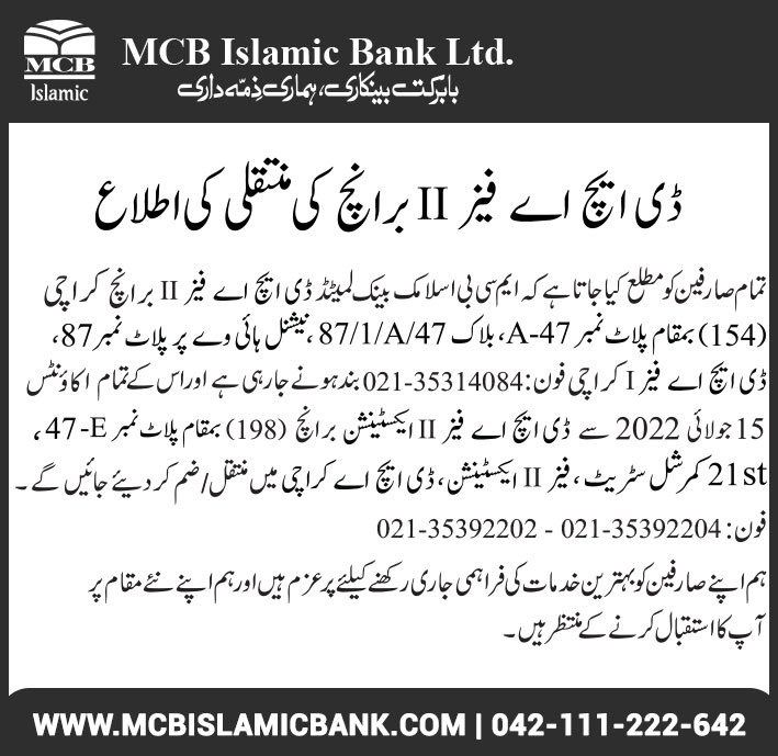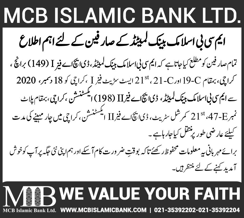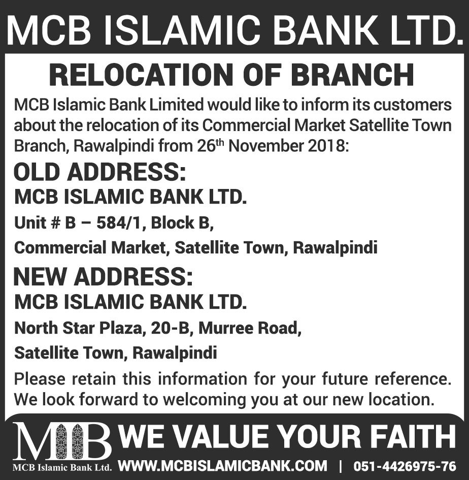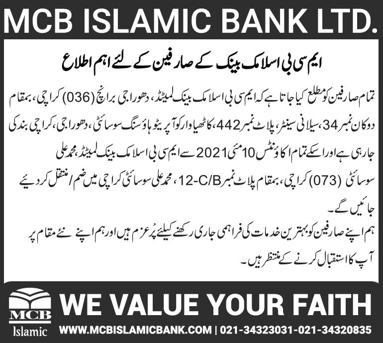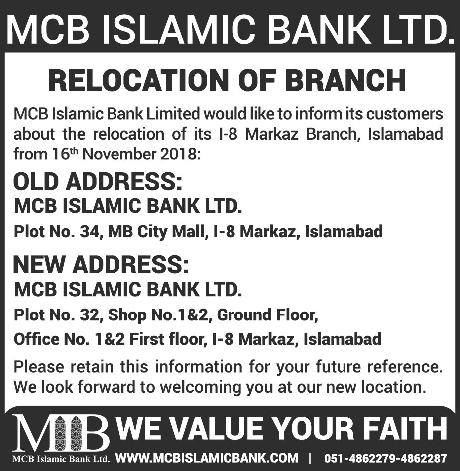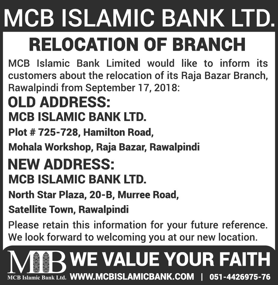 Relocation of MCB Islamic Bank Dhoraji Branch Karachi