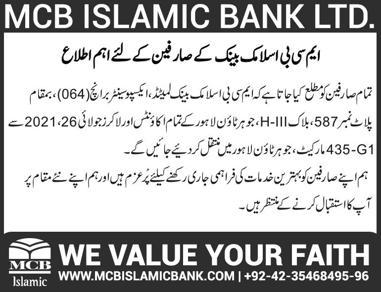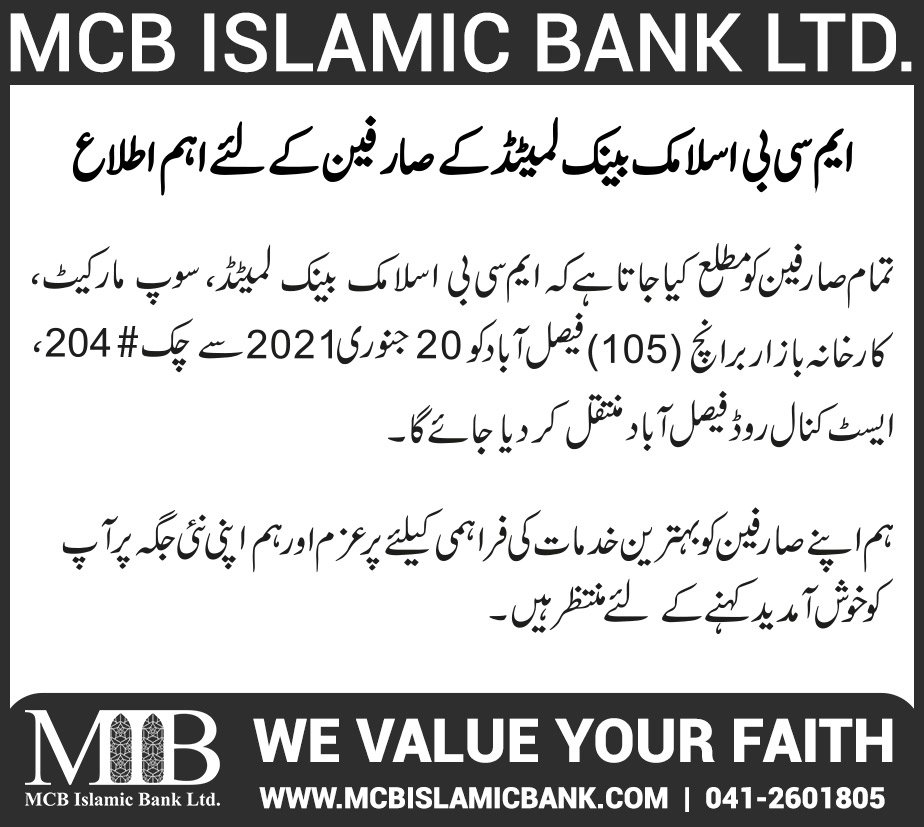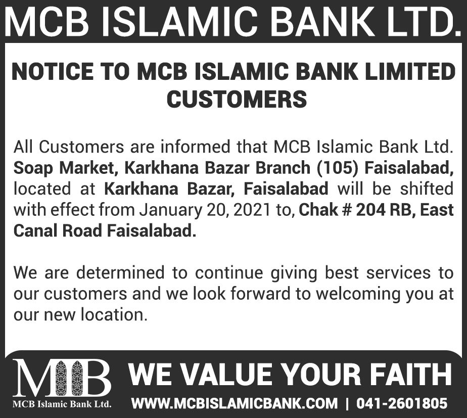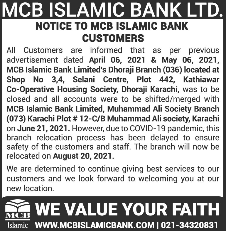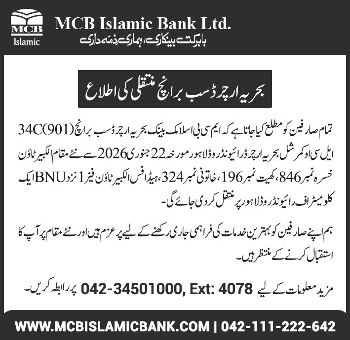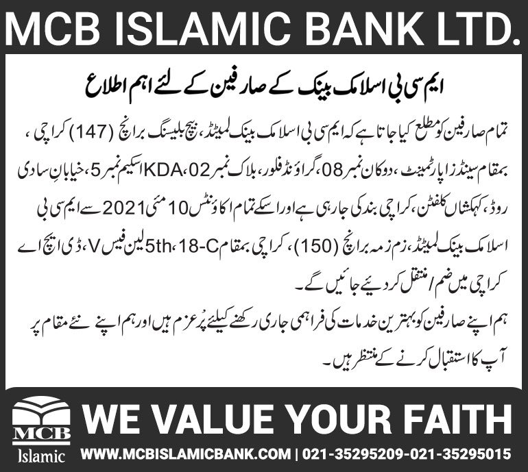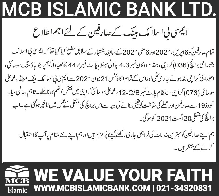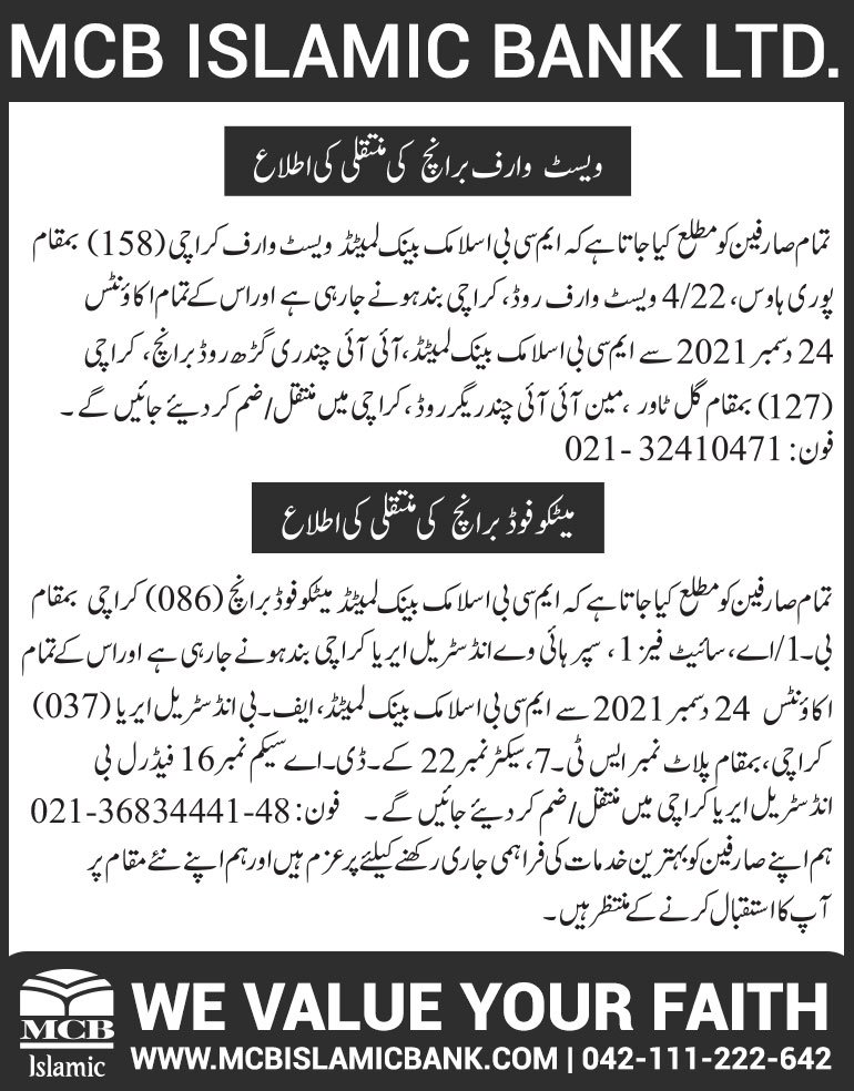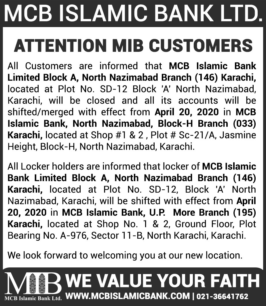 Relocation of MCB Islamic Bank Dhoraji Branch Karachi