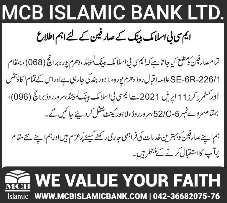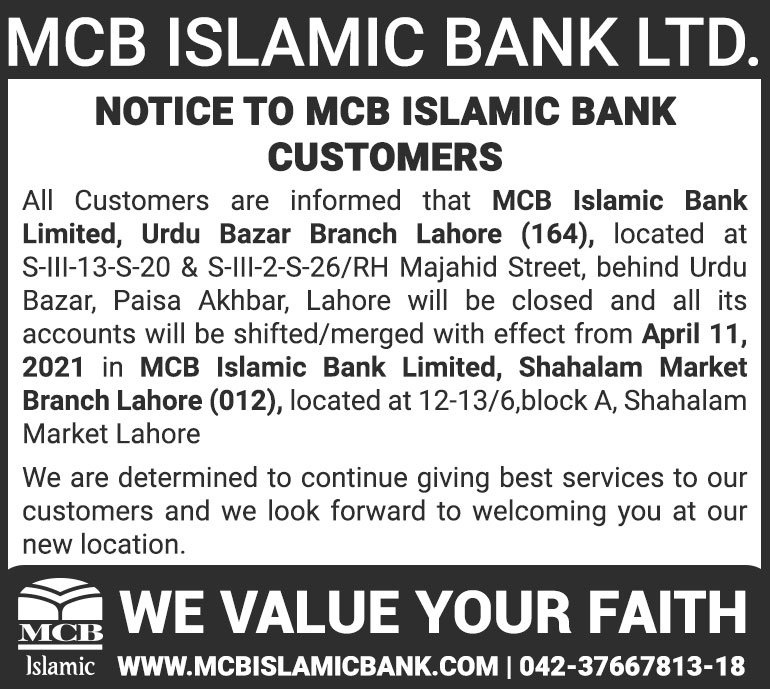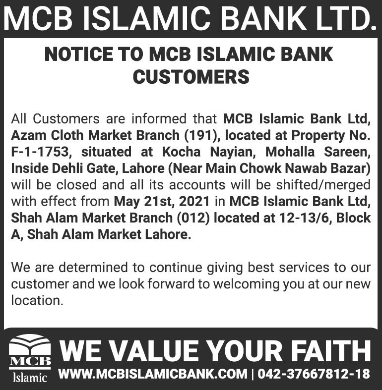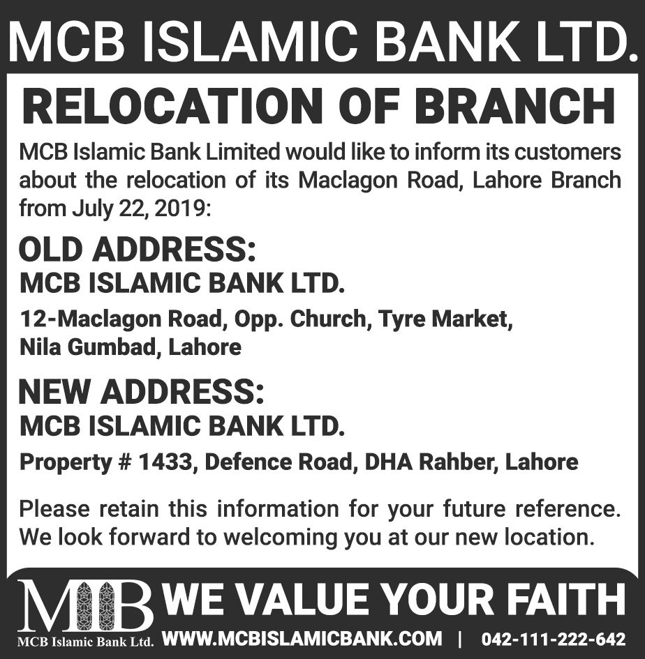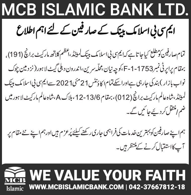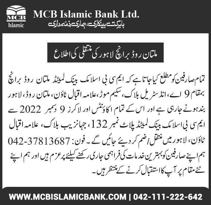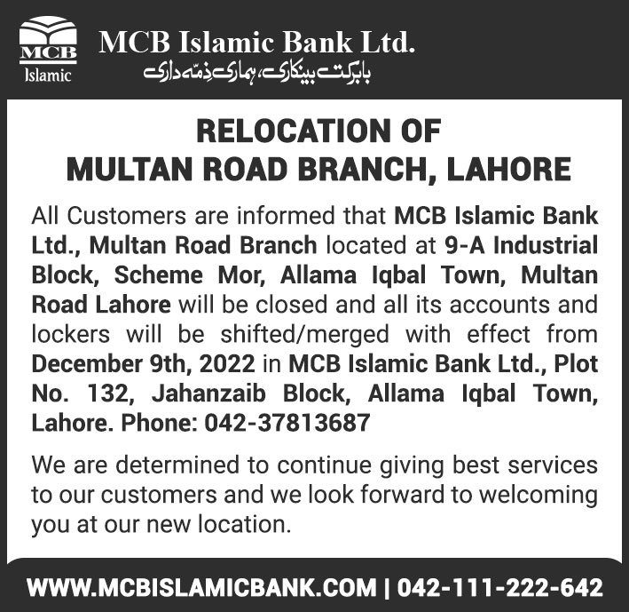 Closure of MCB Islamic Bank Multan Road Branch, Lahore