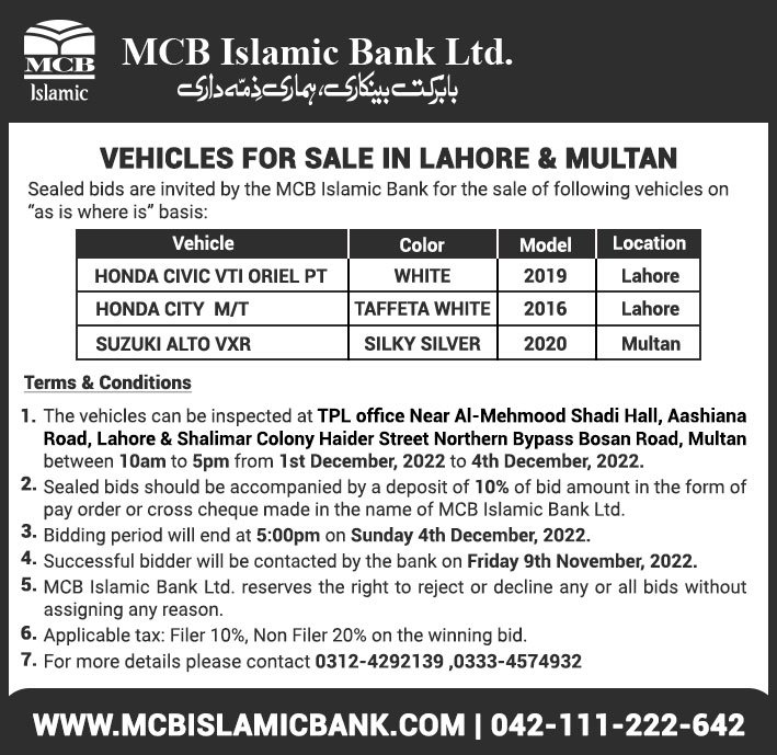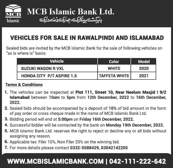 Auction Ad – Vehicle for Sale in Rawalpindi & Islamabad (December 11, 2022)