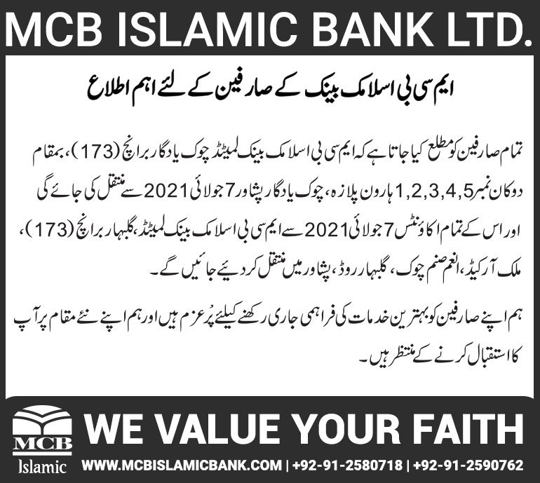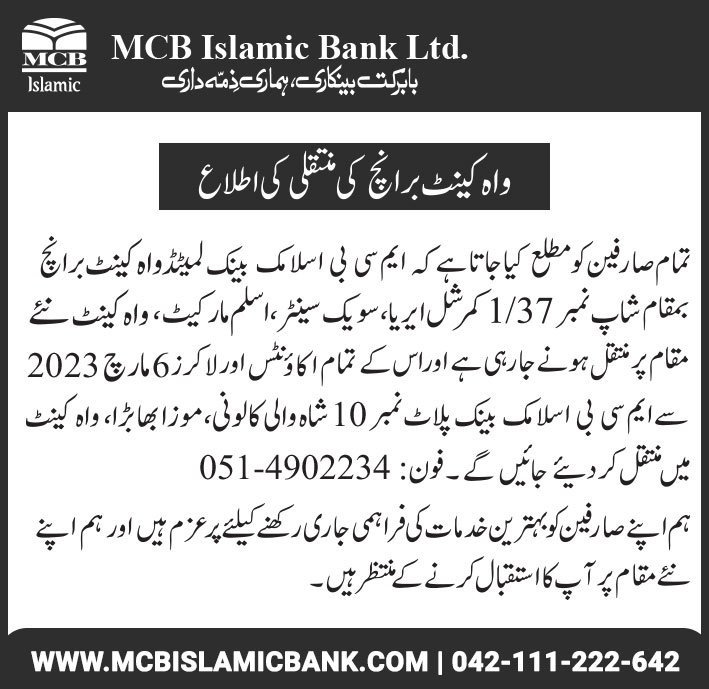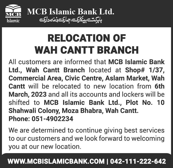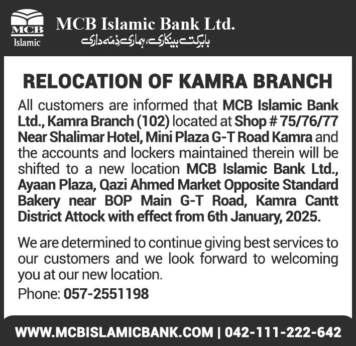 Relocation of MCB Islamic Bank Kamra Branch