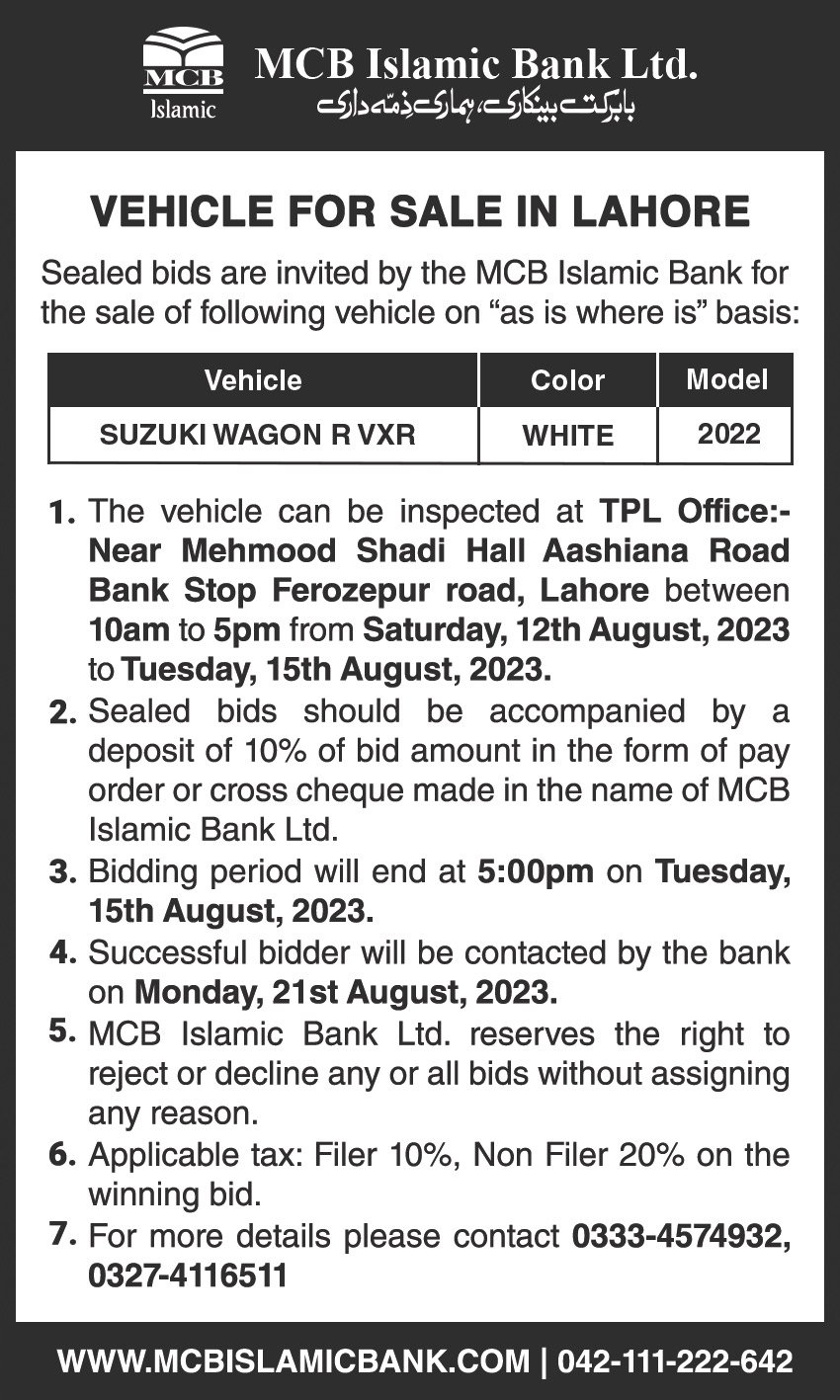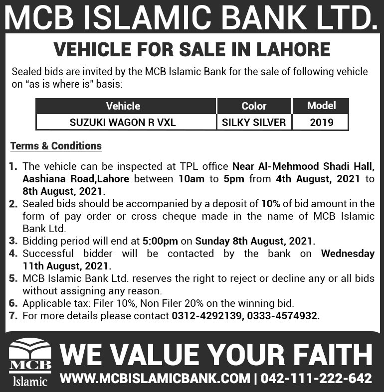 Auction Ad – Vehicle for Sale in Lahore (August 04, 2021)