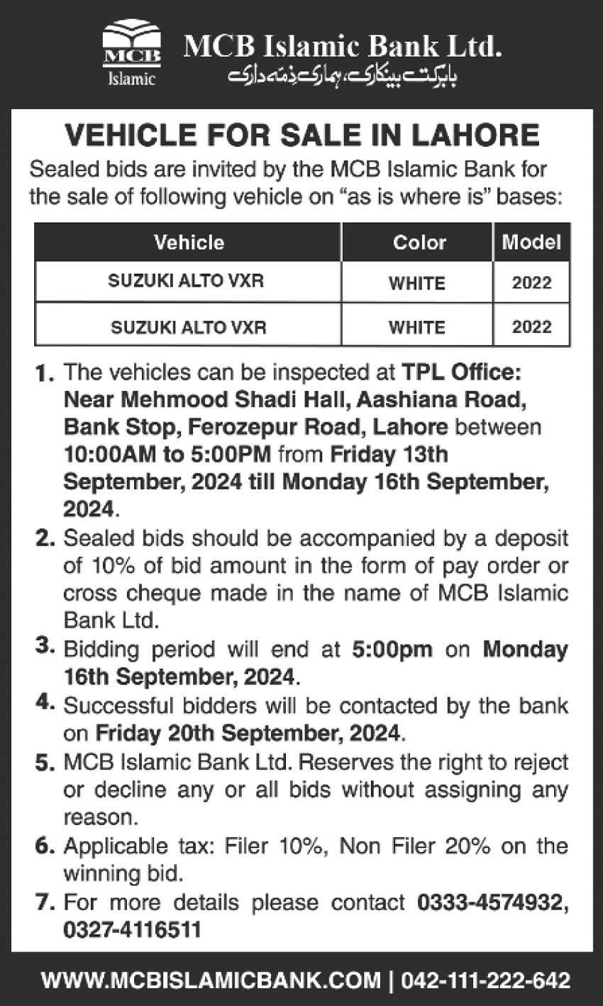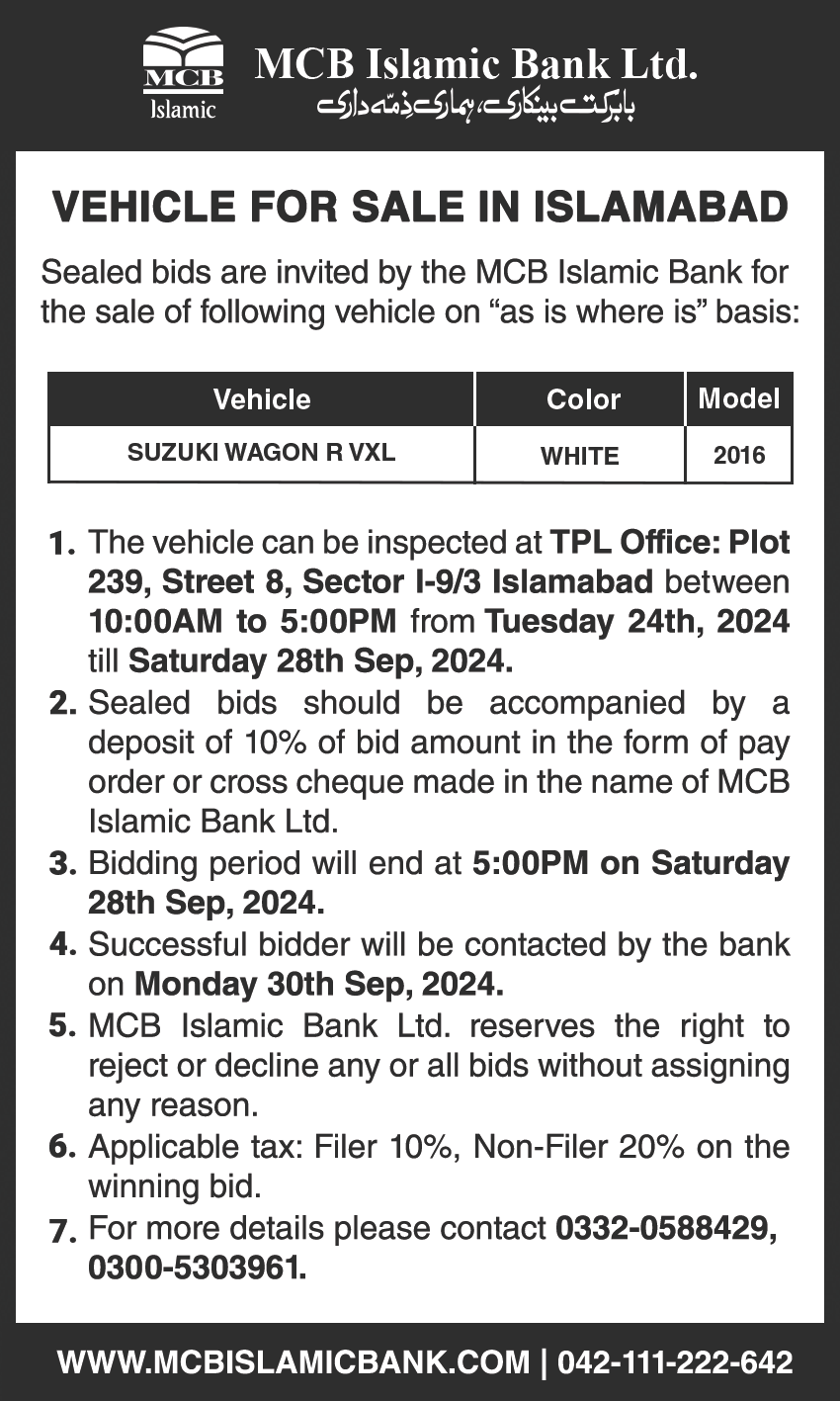 Auction Ad- Vehicle for Sale in Islamabad (September 24, 2024))