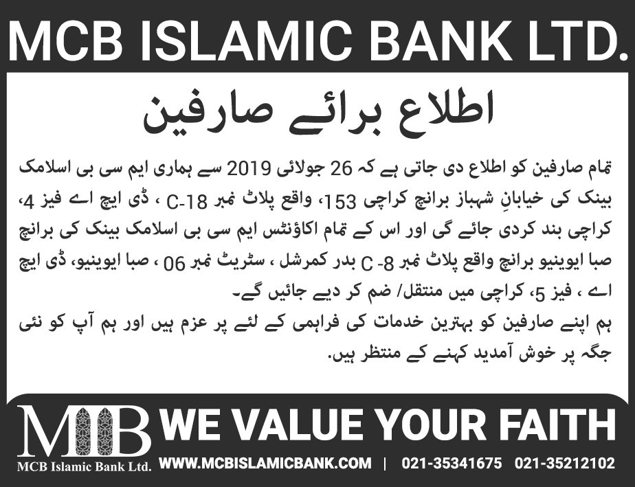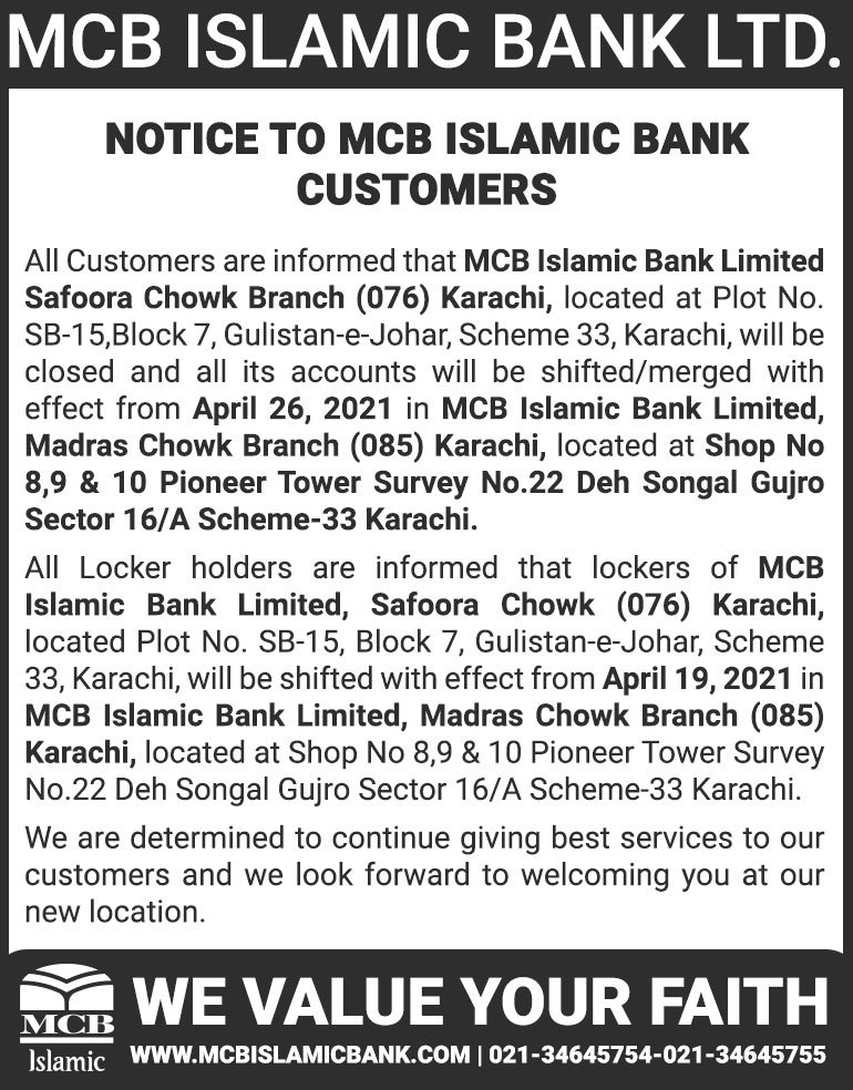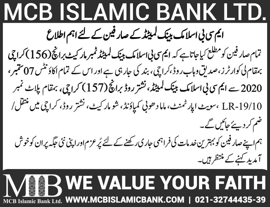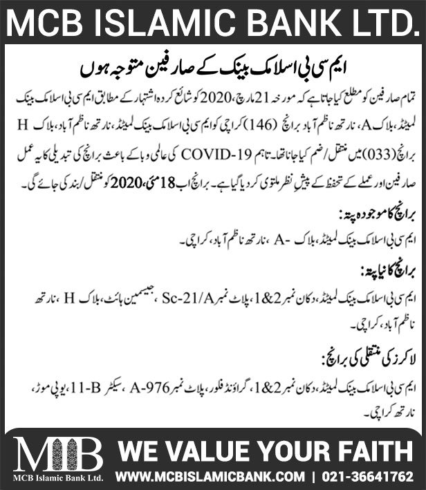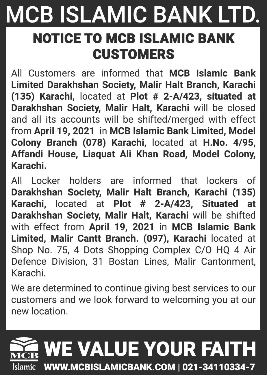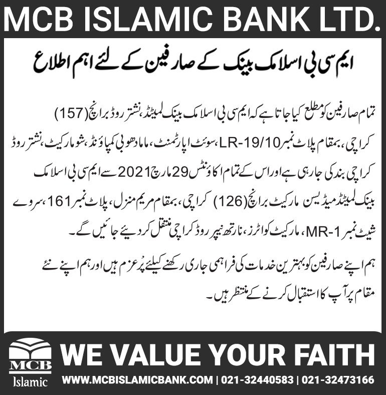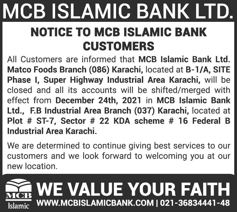 Closure of MCB Islamic Bank MATCO and West Warf, Karachi Branches