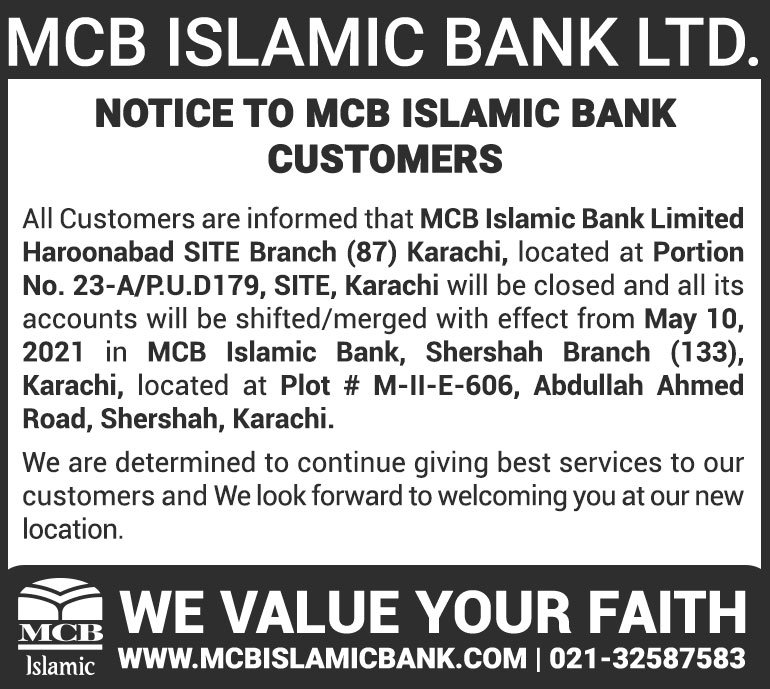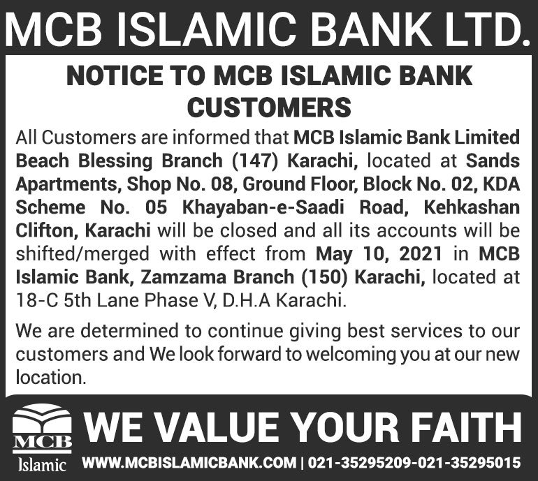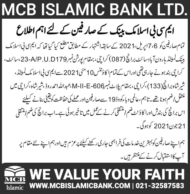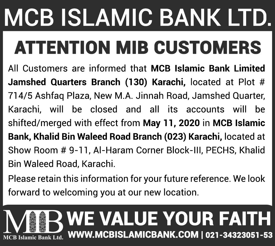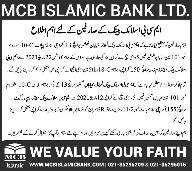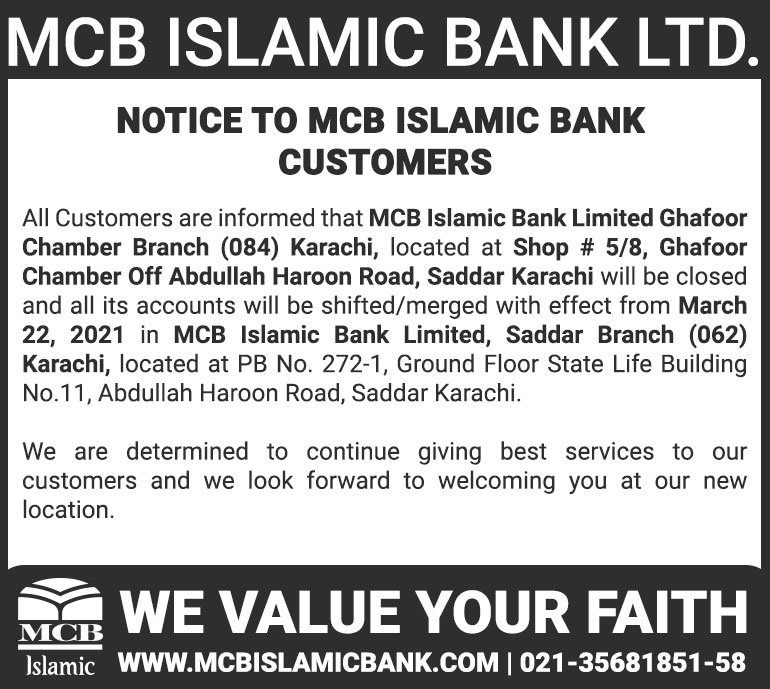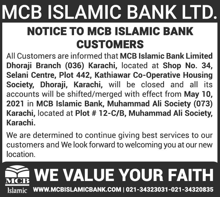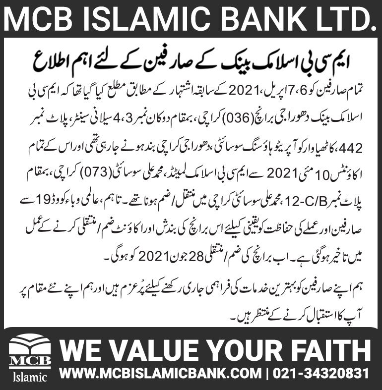 Closure of MCB Islamic Bank MATCO and West Warf, Karachi Branches