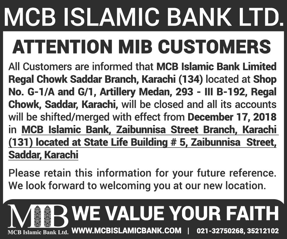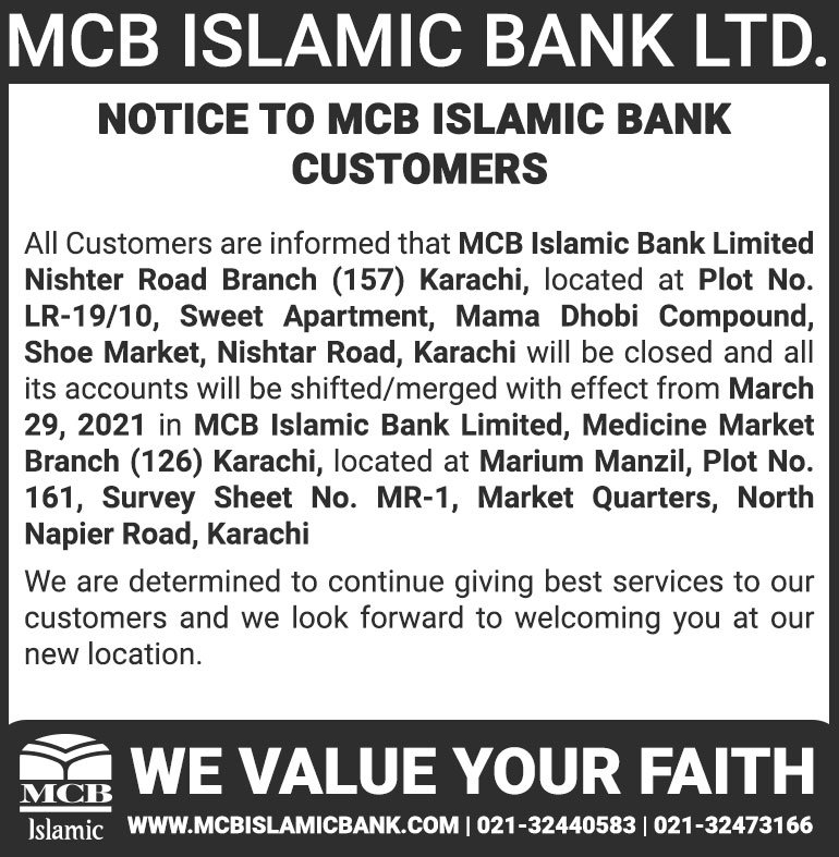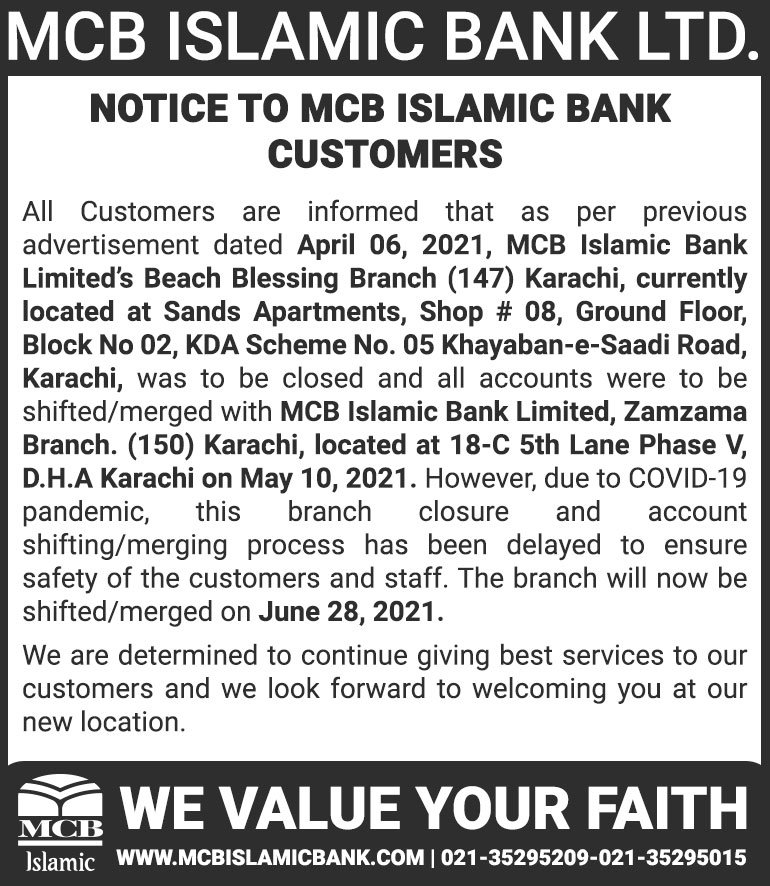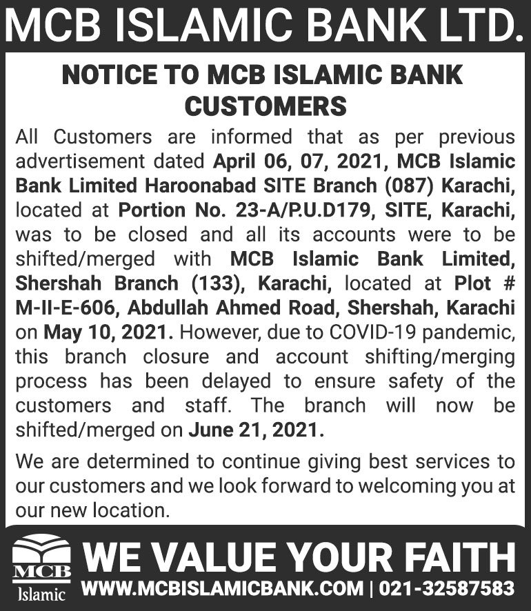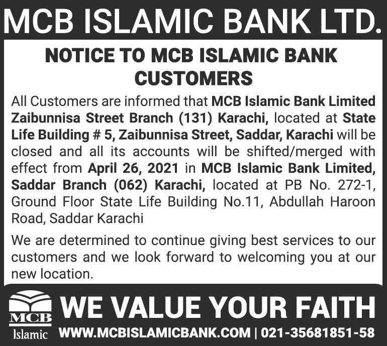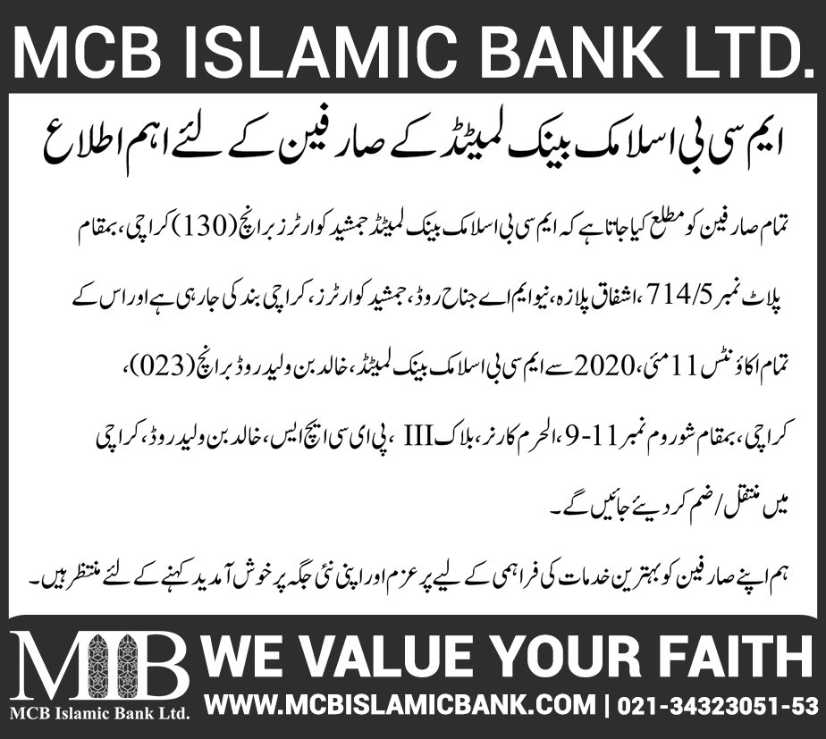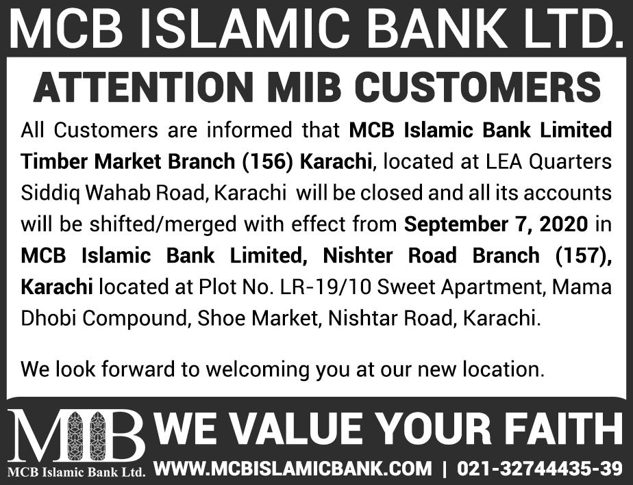 Closure of MCB Islamic Bank MATCO and West Warf, Karachi Branches