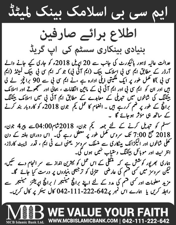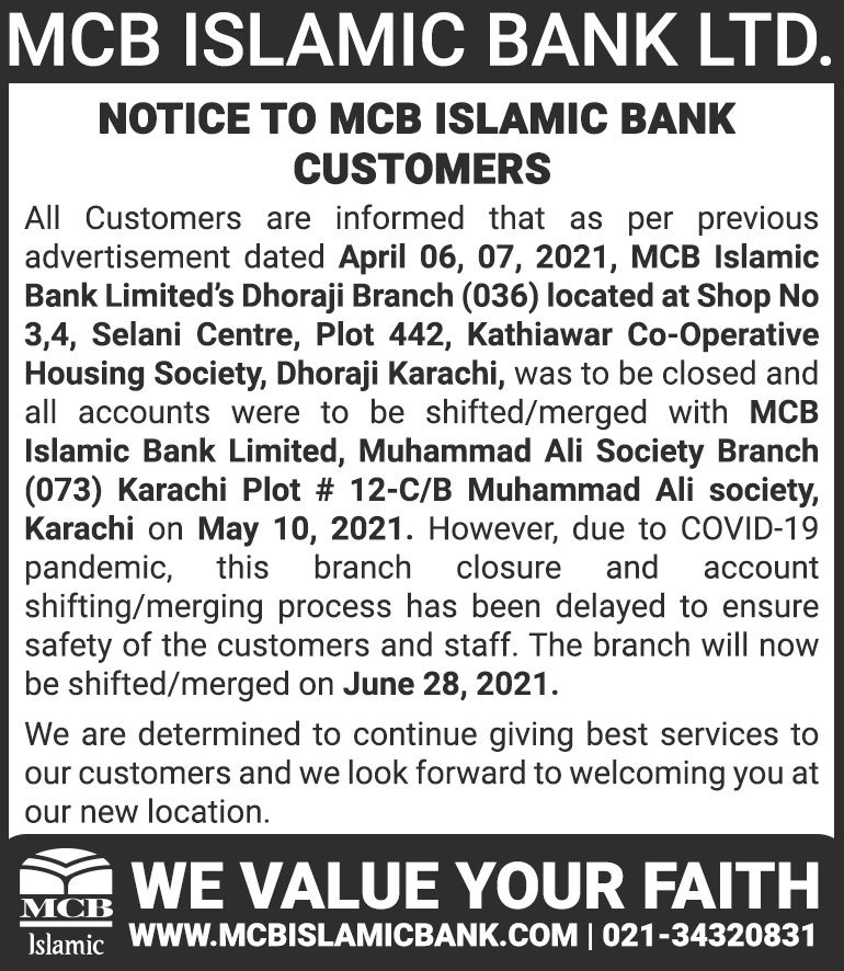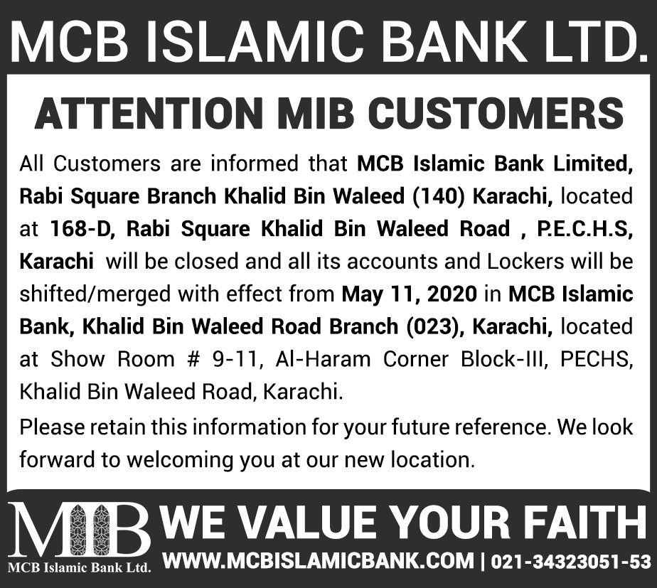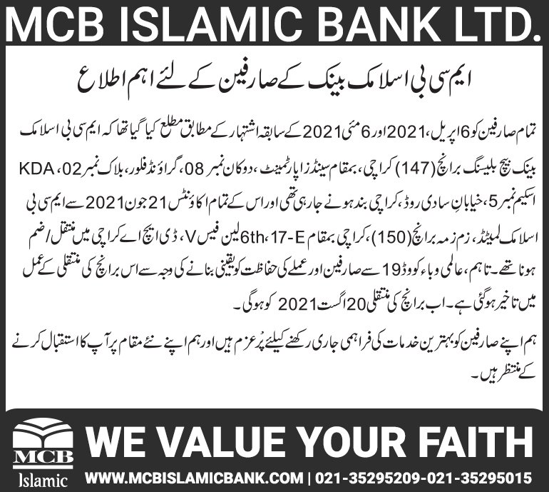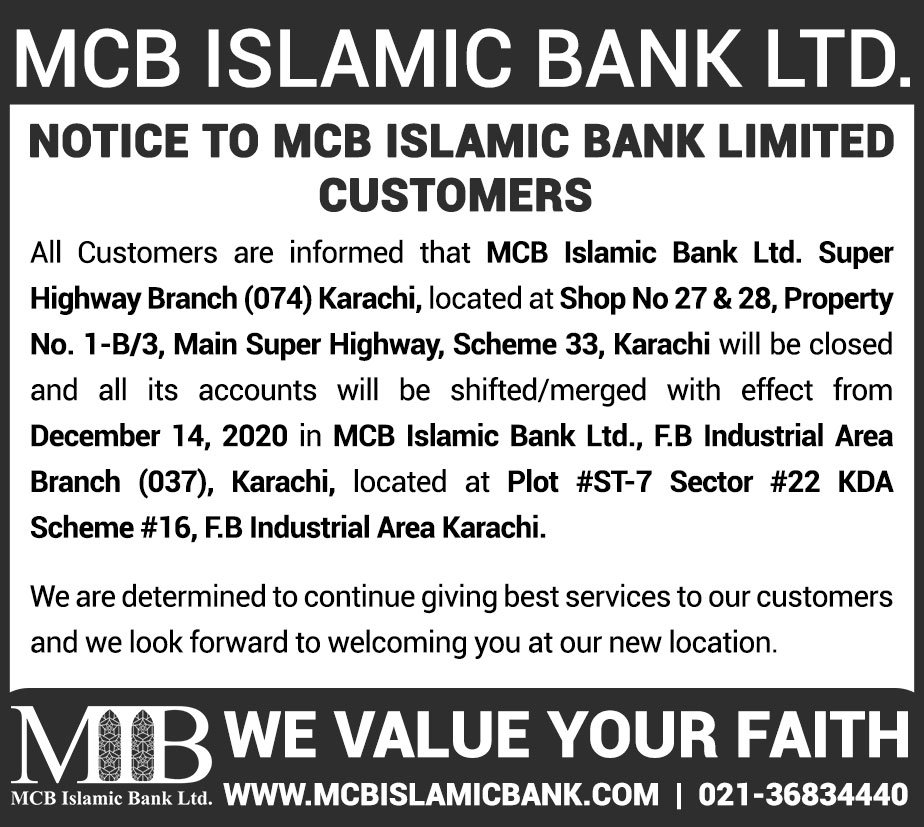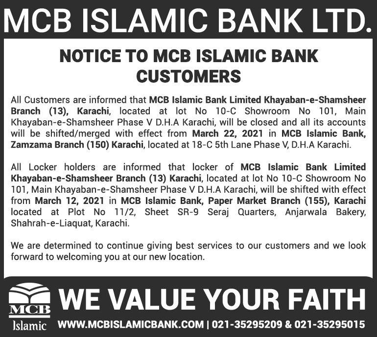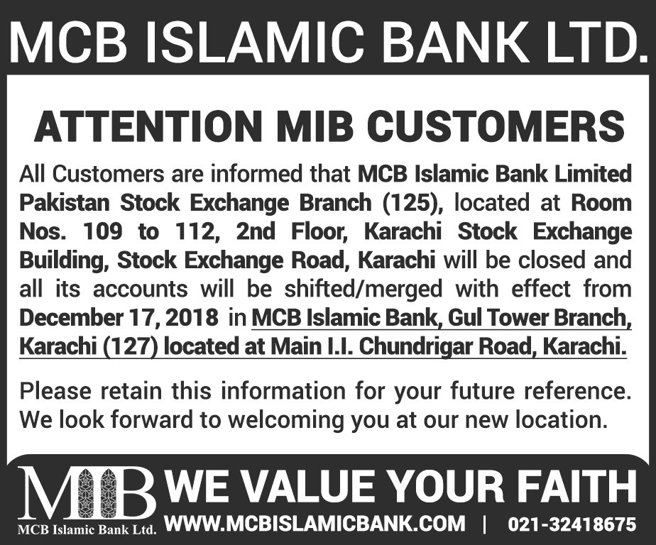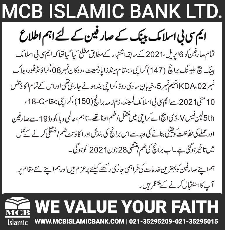 Closure of MCB Islamic Bank MATCO and West Warf, Karachi Branches