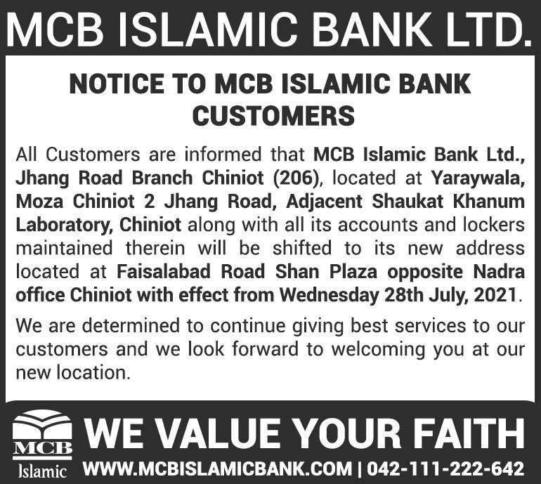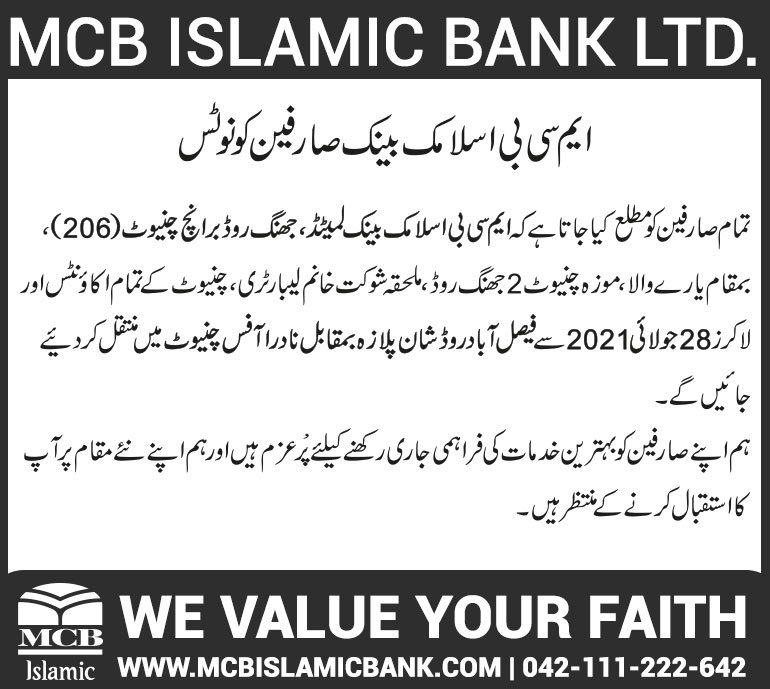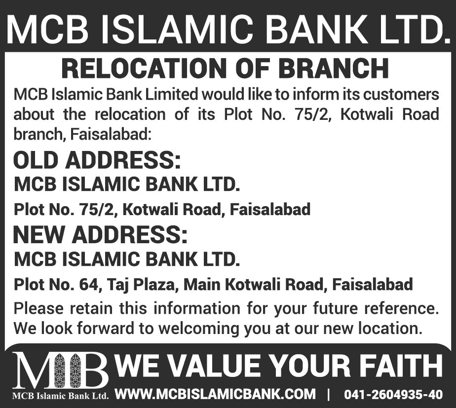 Relocation of MCB Islamic Bank Chiniot Branch
