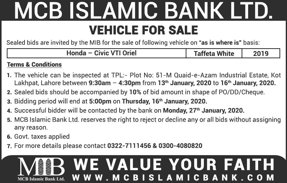 Auction Ad – Vehicle for Sale in Lahore (Jan 09, 2021)