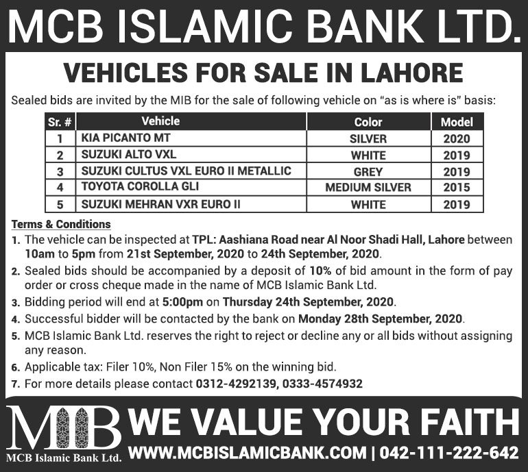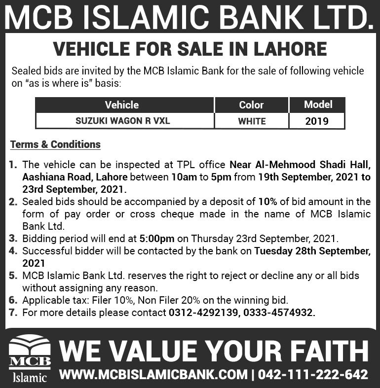 Auction Ad – Vehicle for Sale in Lahore (September 19, 2021)