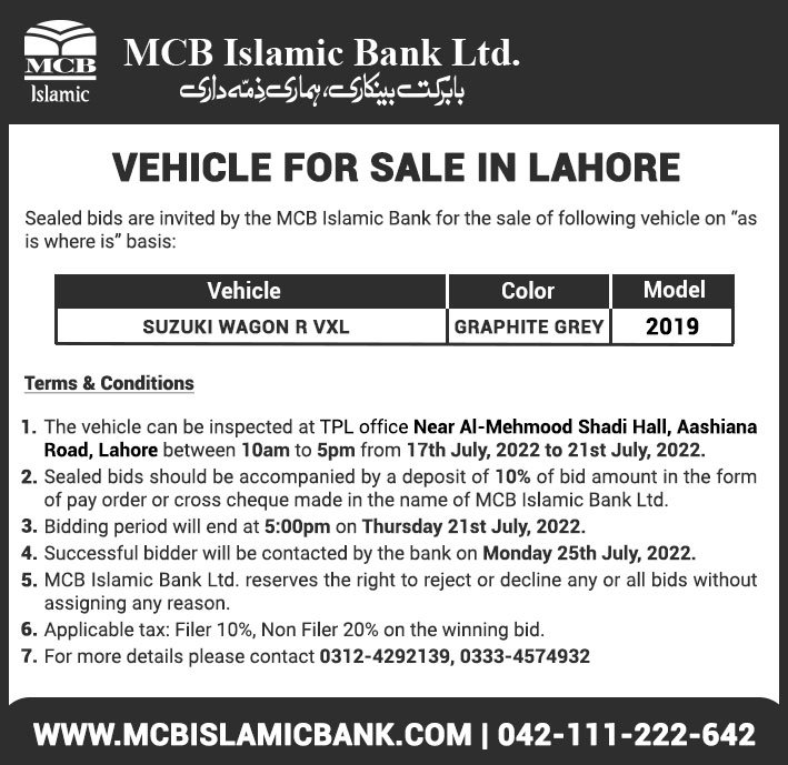 Auction Ad – Vehicle for Sale in Lahore (July 17, 2022)