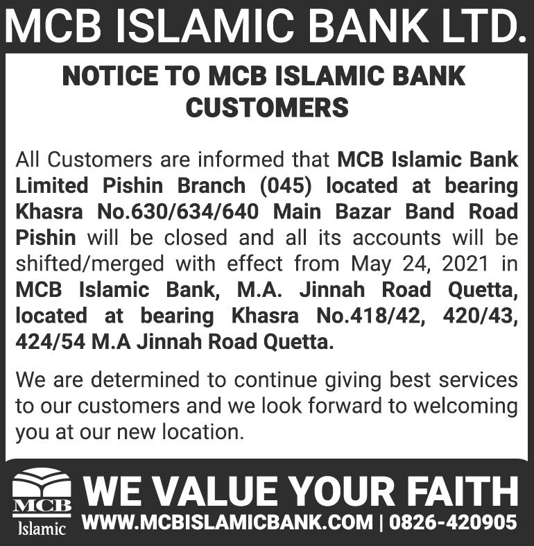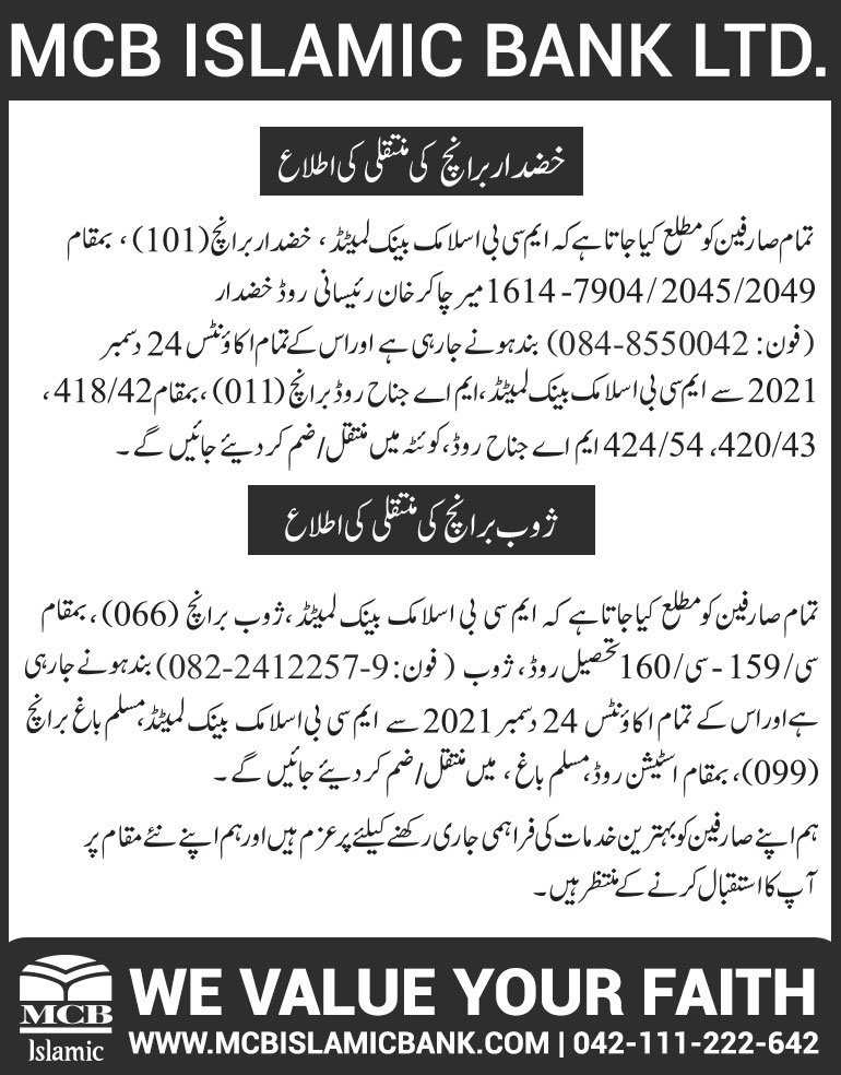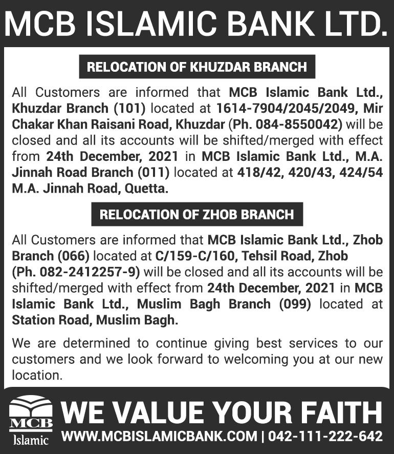 Closure of MCB Islamic Bank Zhob and Khuzdar Branches