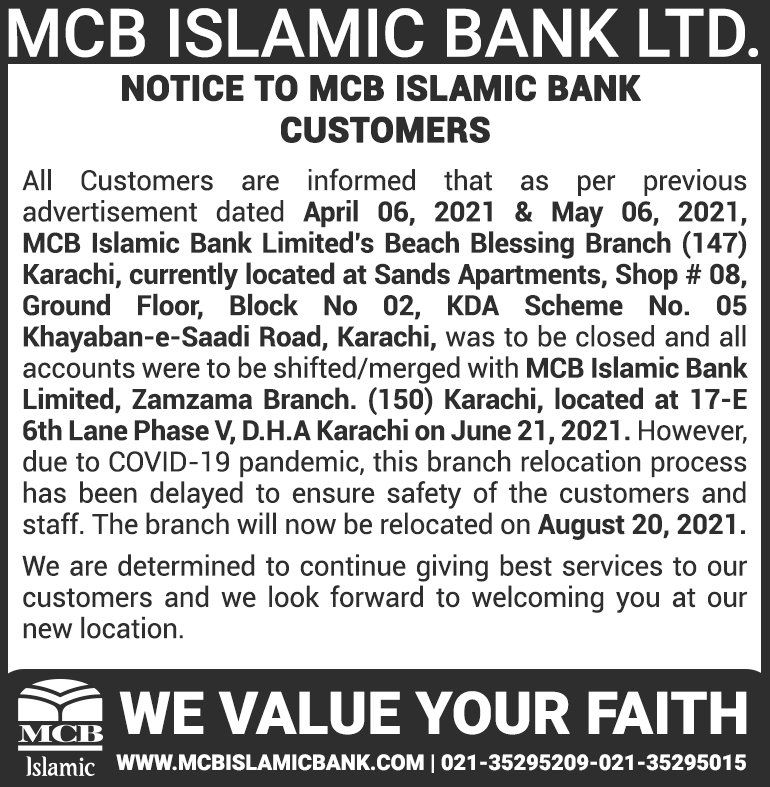 Relocation of MCB Islamic Bank Beach Blessing Branch Karachi