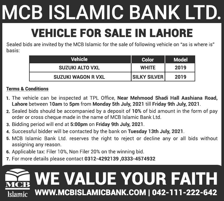 Auction Ad – Vehicle for Sale in Lahore (July 04, 2021)