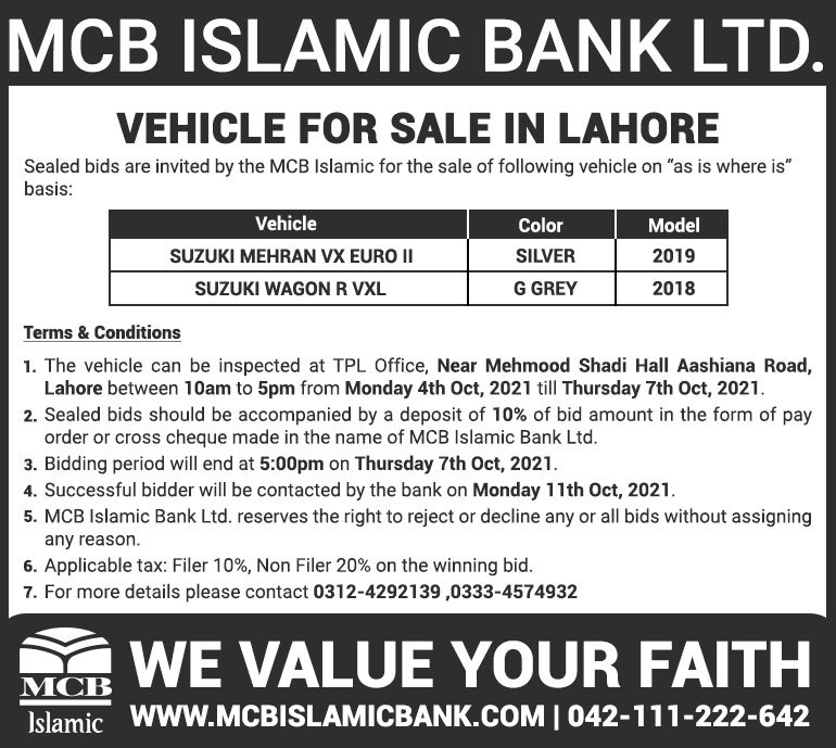 Auction Ad – Vehicle for Sale in Lahore (October 03, 2021)