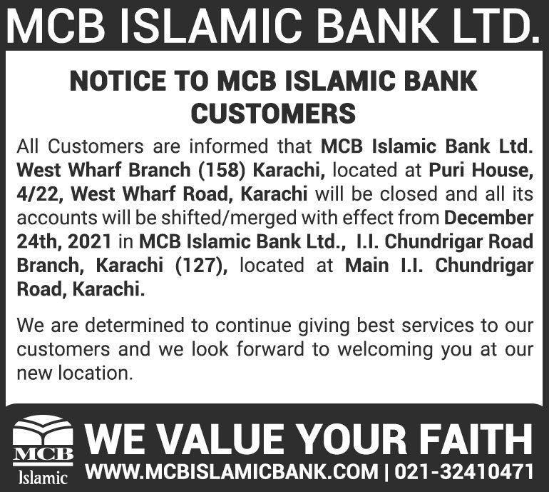 Closure of MCB Islamic Bank West Warf Branch, Karachi