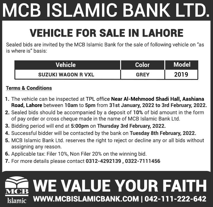 Auction Ad – Vehicle for Sale in Lahore (January 30, 2022)
