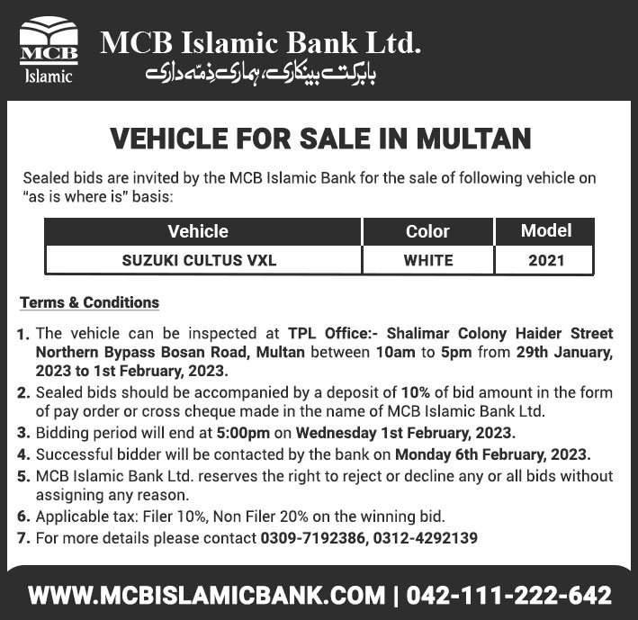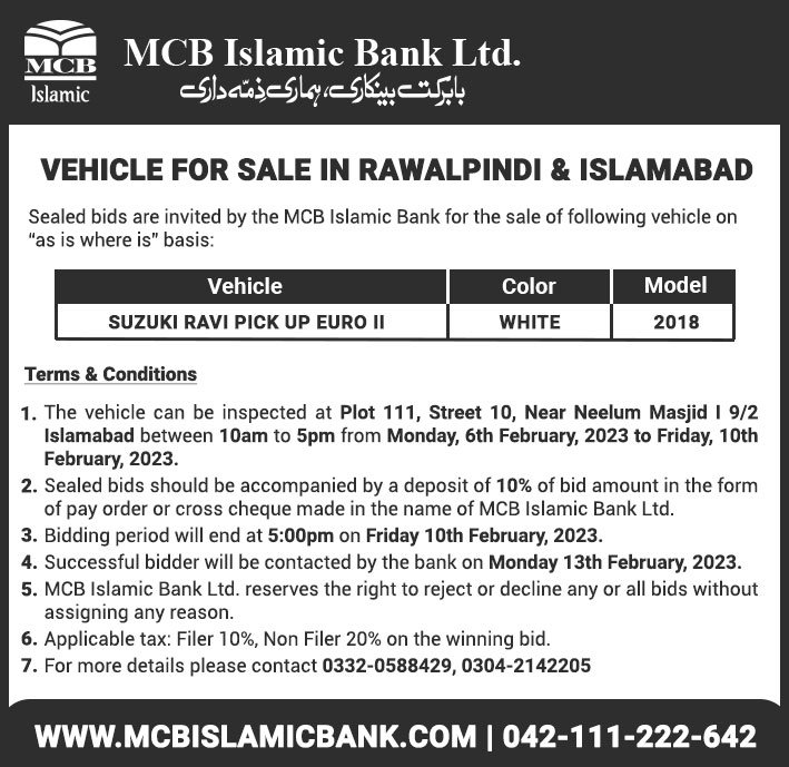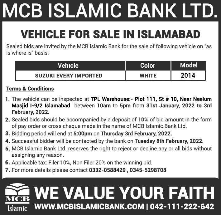 Auction Ad – Vehicle for Sale in Islamabad (January 30, 2022)