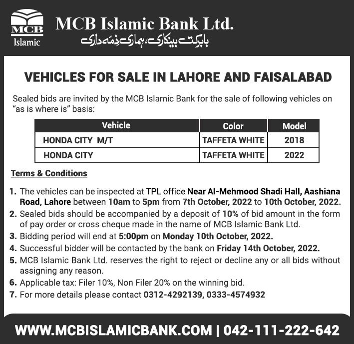 Auction Ad – Vehicle for Sale in Lahore & Faisalabad (October 07, 2022)