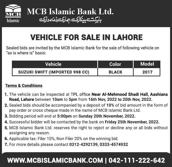 Auction Ad – Vehicle for Sale in Lahore (November 16, 2022)