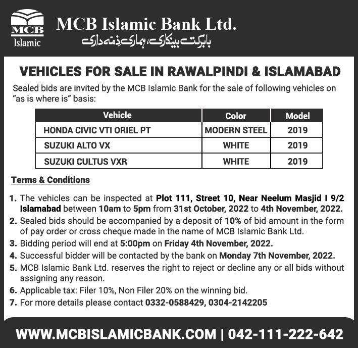Auction Ad – Vehicle for Sale in Rawalpindi & Islamabad (October 30, 2022)