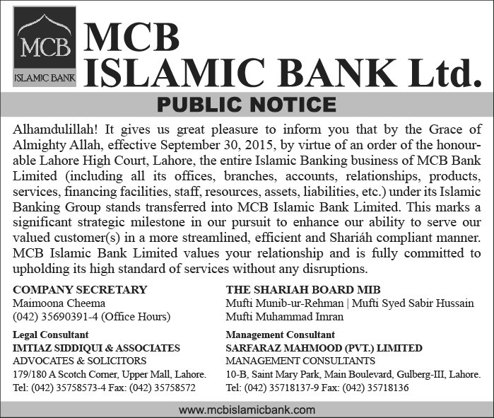 Transfer of MCB IBG for MCB Islamic Bank Ltd.